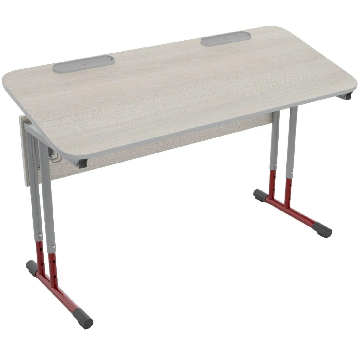 Двухместный ученический стол с переменным наклоном столешницы , регулируемый по высоте. Столешница имеет закругленные углы. Опоры стола изготовлены из круглой трубы, регулируются от третьей до седьмой ростовой группы без специального инструмента. Стол подходит для начальной, средней и старшей школы. Столешница толщиной 16 мм обработана кромкой ПВХ 2 мм. Под столешницей находится траверса жесткости. Угловое перемещение столешницы осуществляется с помощью специальных механизмов (растомат 5 положений).