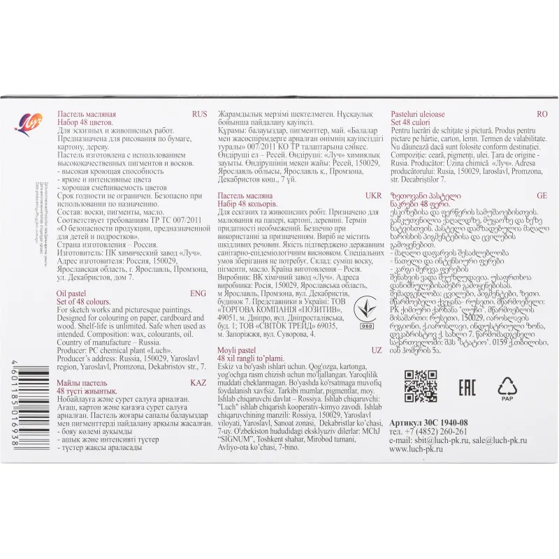 Каждый мелок круглой формы имеет длину 60 мм и ширину 9.5 мм. Обёртка из бумаги защищает руки от загрязнений во время рисования. В набор входит 48 цветов, включая сложные и дополнительные оттенки, подходящие для работы с нюансами освещения и полутонами. Упаковка выполнена из картона, её размер — 290×191×17 мм. Хранить пастель рекомендуется в сухом помещении при температуре выше 0°C, избегая прямого солнечного света и близости к источникам тепла.