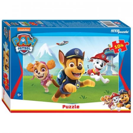 Пазл «Щенячий патруль» состоит из 104 деталей. На картинке мы видим трех героев-спасателей — Гонщика, Скай и Маршала. Они бегут навстречу новым приключениям, ведь отважным щенкам все по зубам!