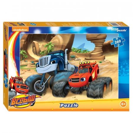 Пазл «Вспыш и чудо-машинки» состоит из 260 деталей. На картинке изображены две машинки — сам Вспыш и его главный соперник Крушила. Кто же станет победителем в этой гонке по пустыне?