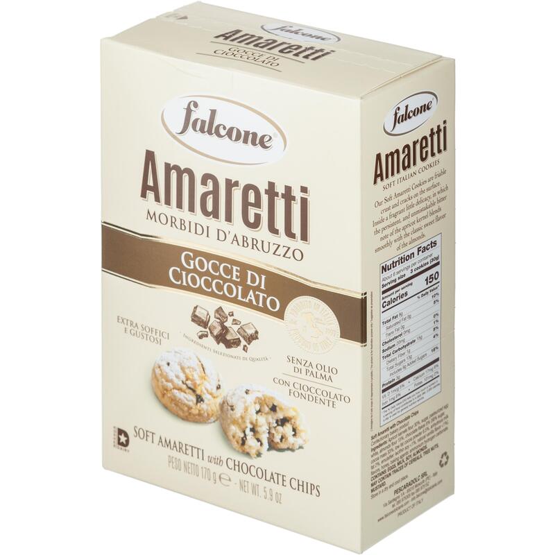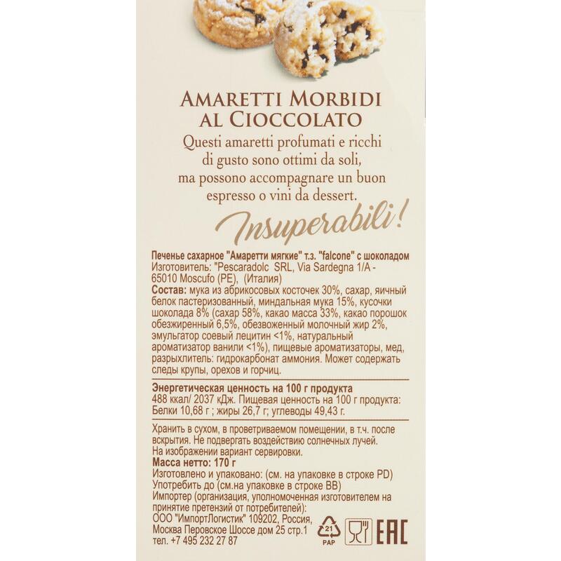 Печенье сахарное Falcone Амаретти с шоколадом 170 г.Состав: мука из абрикосовых косточек 30%, сахар, яичный белок пастеризованный, миндальная мука 15%, кусочки шоколада 8% (сахар 58%, какао масса 33%, какао порошок обезжиренный 6,5%, обезвоженный молочный жир 2%, эмульгатор соевый лецитин <1%, натуральный ароматизатор ванили <1%), пищевые ароматизаторы, мед, разрыхлитель Е503 II — Гидрокарбонат аммония. Пищевая ценность: белки — 14 г; жиры — 23 г; углеводы — 45 г. Энергетическая ценность: 451 ккал. Срок годности: 10 месяцев.Хранить при температуре от 13°С до 23°С и относительной влажности воздуха не более 75%. Тип упаковки: картонная. Страна производства: Италия.