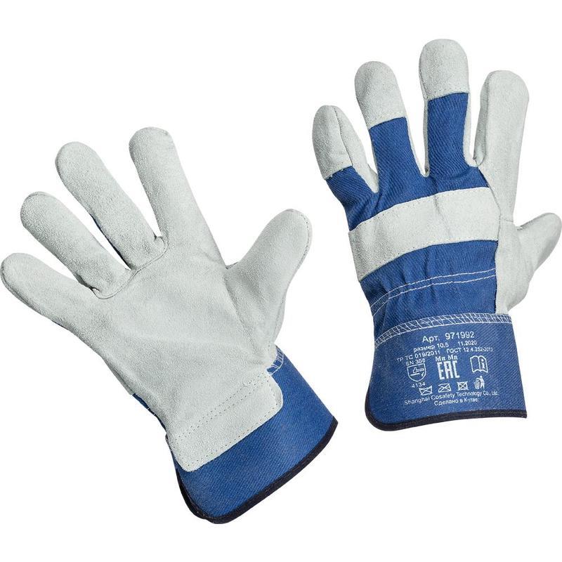 Универсальные рабочие перчатки комбинированные, выполнены из спилка КРС и плотной хлопковой ткани. Спилок коровий, мягкий, сорта АВ. Флисовая подкладка на ладонной части. Двойные швы. Полное покрытие спилком большого и указательного пальцев. Высокая стойкость к истиранию и разрыву, ограниченная защита от прокола и пореза. Материал: спилок КРС толщиной 1.0 мм −1.3 мм, хлопковая ткань. Манжет: жесткая прорезиненная крага. Размер перчаток: 10.5. ТР ТС 019/2011.