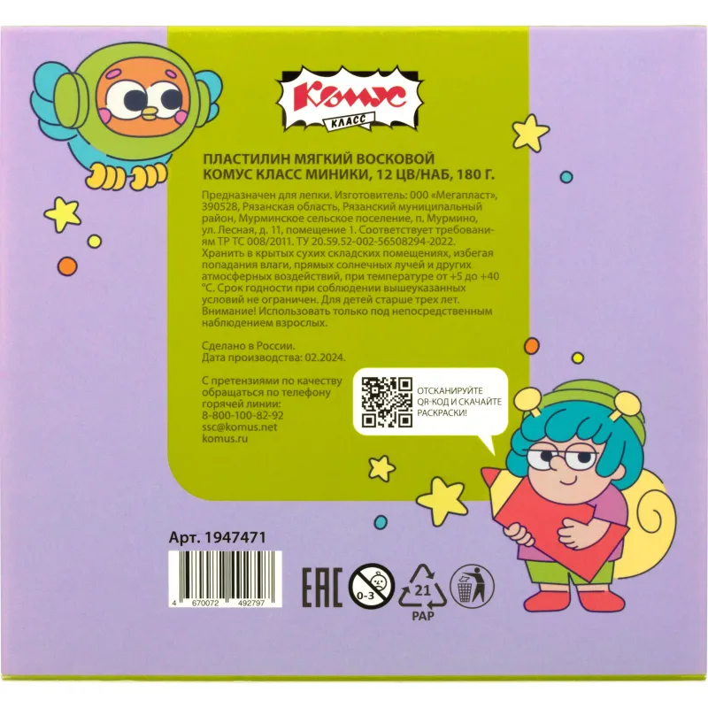 Пластилин мягкий восковой «Комус Класс Миники» — набор из 12 брусков качественного воскового пластилина. Лепка — одно из самых полезных и продуктивных занятий для детей. Она способствует развитию воображения, мышления, мелкой моторики, дает возможность ребенку моделировать мир и свое представление о нем. С пластилином «Комус Класс Миники» лепка снизит напряжение, займет ребенка на несколько минут или даже часов, отвлечет от телевизора или планшета. Пластилин может использоваться в детских садах, школах, художественных кружках или же просто в домашних условиях. Преимуществом этого пластилина является то, что он сделан на основе воска — восковой пластилин мягче, быстрее разминается, не крошится, ярче передает цвета. Он отлично подойдет для самых маленьких скульпторов. Цветовая гамма — классическая, в набор входит стека для более точного и детального моделирования. Пластилин «Комус Класс Миники» — это возможность дать волю воображению и радоваться своим успехам.