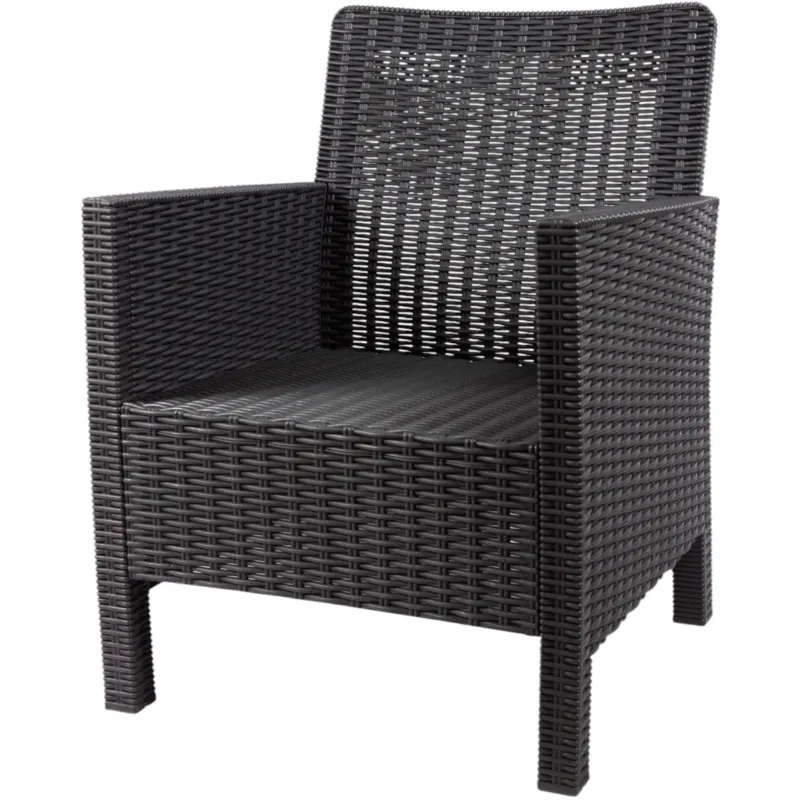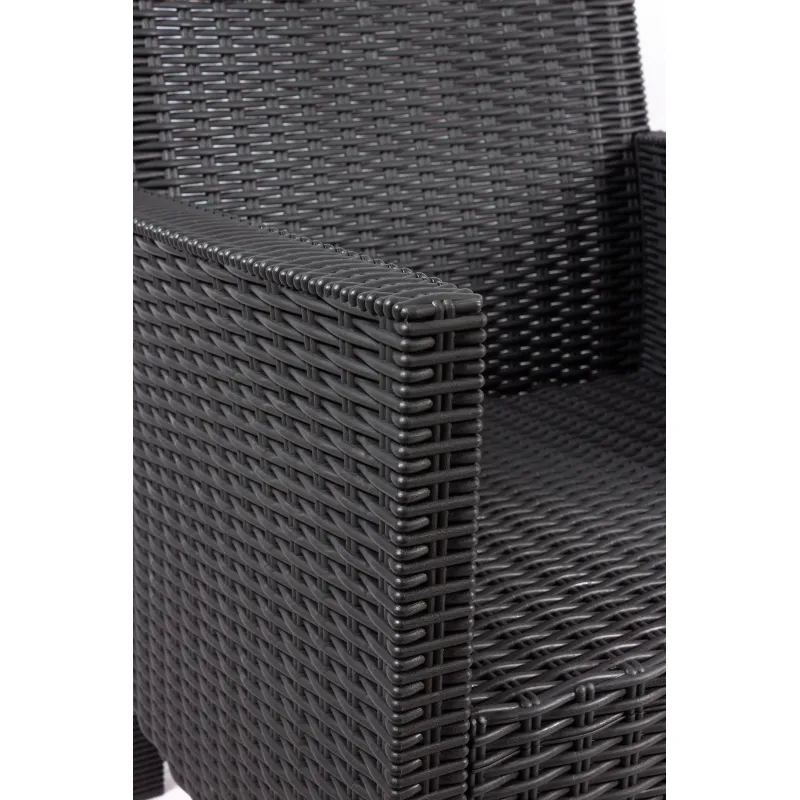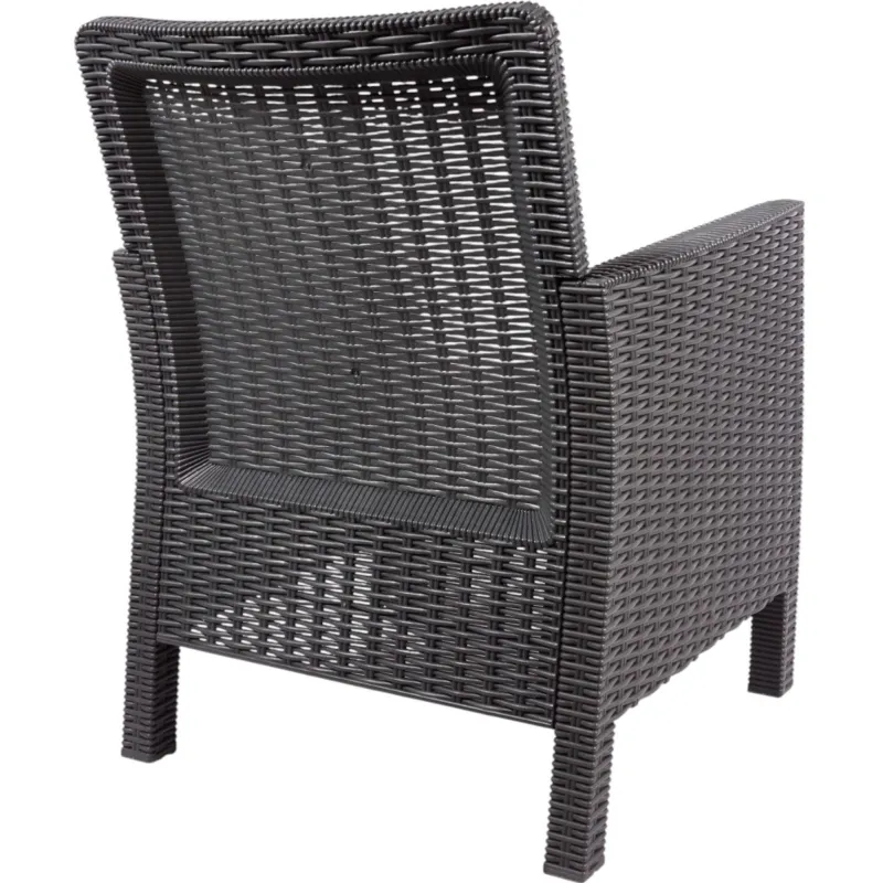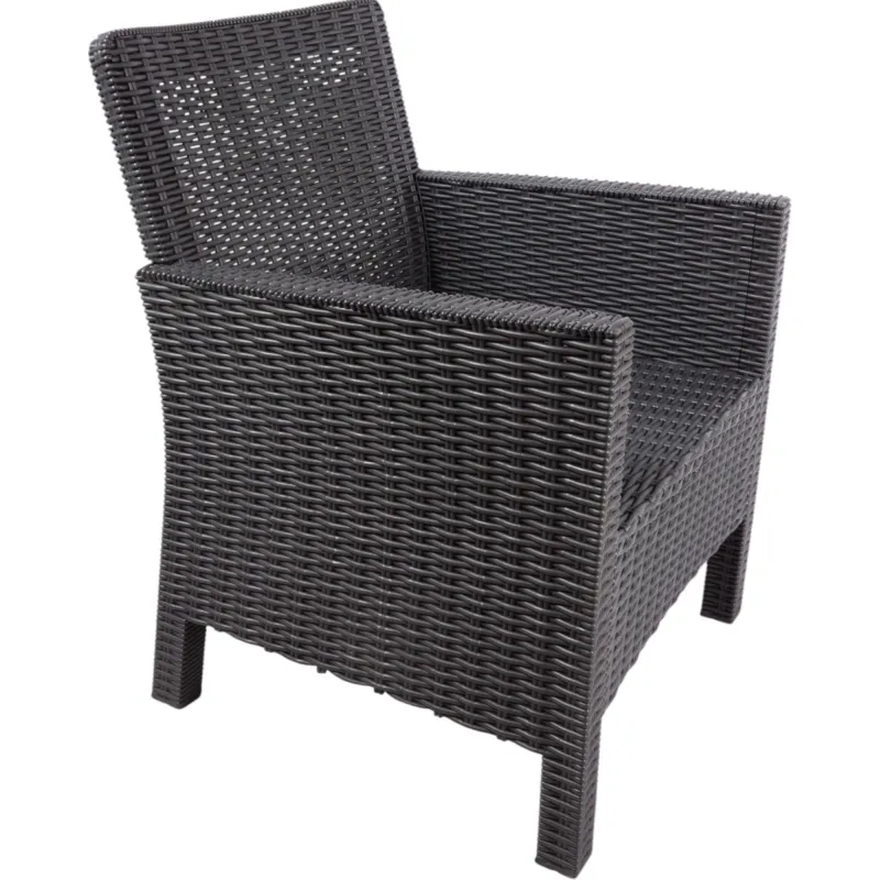 Кресло TDT из искусственного ротанга, цвет тёмно-серый. Изготовлено из качественного полипропилена: достаточно прочный пластик, лёгкий и устойчивый к воздействию внешних условий. Лёгкая и быстрая сборка, безболтовое надёжное соединение. Не выгорает на солнце, не трескается на морозе, антиаллергенный, неприхотлив в уходе. Подходит как для загородного дома, для балконов и террас, так и для оформления входной группы в кафе, магазин или офис. Для Комплекта в ассортименте есть Диваны двухместные. Максимальная нагрузка 120 кг.