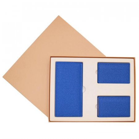 Набор ’Натали’ синего цвета. Состоит из 3-х предметов (еженедельник недатированный (175x85 мм), визитница на 20 визиток, 10 карманов в 1 ряд (103x65 мм), кредитница на 6 карт, 6 карманов в 1 ряд (103x65мм). Обложка из высококачественного переплетного материала, фактурного и термоактивного кожезаменителя, подходит для горячего тиснения. Упаковка подарочная коробка из дизайнерской бумаги бежевого цвета, внутри флокированный ложемент. Размер упаковки 247x183x32 мм.