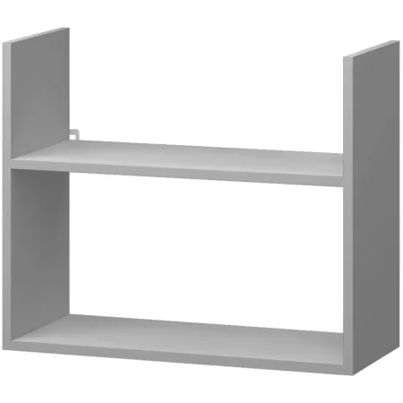 Навесная полка имеет размеры 632×596 мм и глубину 294 мм. Изготовлена из ЛДСП серого цвета. Два отделения (верхнее не имеет ограничения по высоте предметов). Кромки отделаны прочным ПВХ для защиты от повреждений и разбухания.