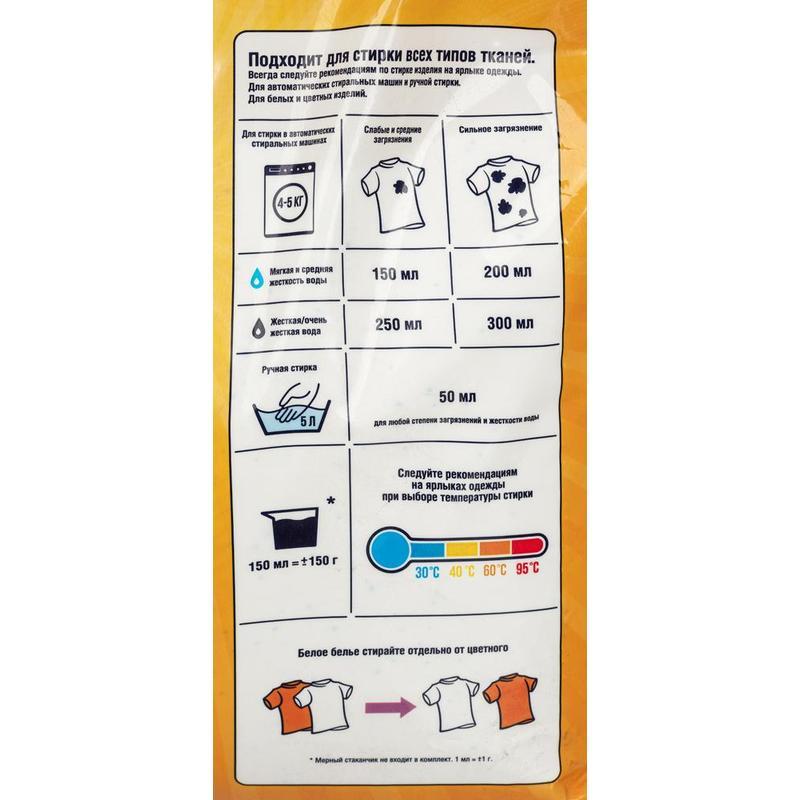 Способ применения: Следуйте рекомендациям на ярлыках одежды и паспорте стиральной машины при выборе режима стирки и температуры. Белое белье стирайте отдельно от цветного. Возможно использовать для ручной стирки. При стирке вручную прополощите белье в теплой, а затем в холодной воде до полного исчезновения пены.