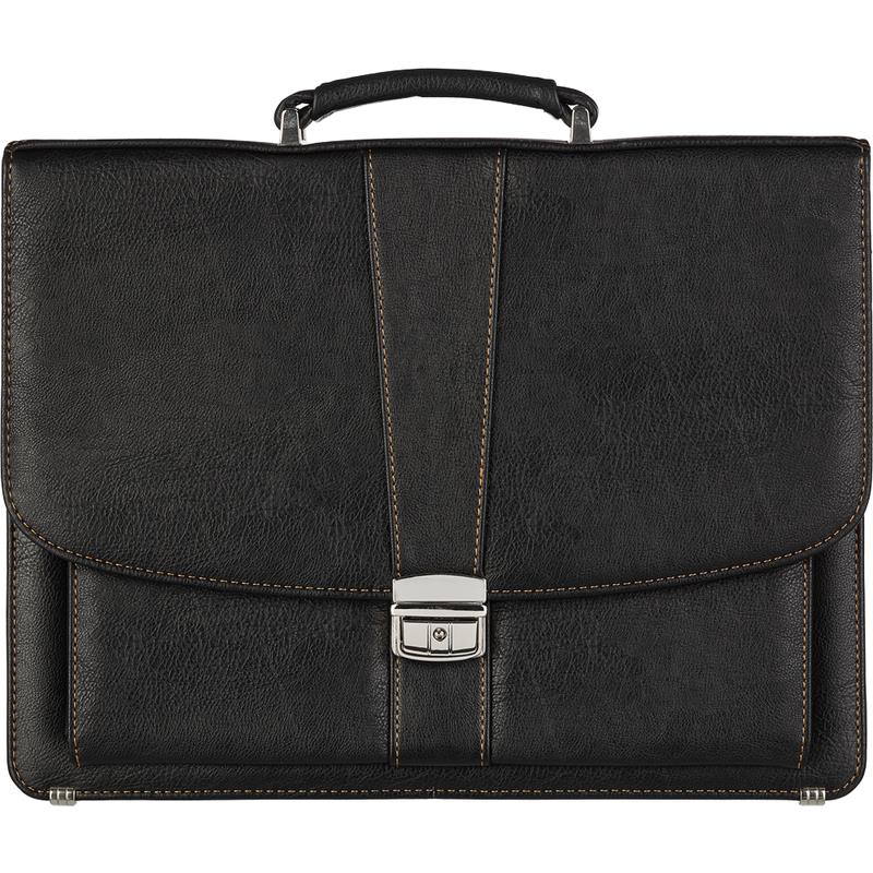 Большой портфель с клапаном на замке. Два основных отделения с карманом-перегородкой, система карманов для мелких документов и держатели для ручек. Объемный карман на передней стенке. Металлические ножки. Съемный плечевой ремень с наплечником. Контрастная отстрочка.