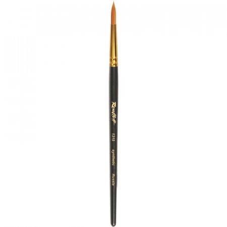 Кисть круглая синтетика Roubloff № 5. Кисть круглая с укороченной вставкой из волоса рыжей жесткой синтетики на короткой матовой черной ручке с алюминиевой обоймой золотого цвета. Техника рисования: Акварель, Акрил, Гуашь, Масло, Темпера