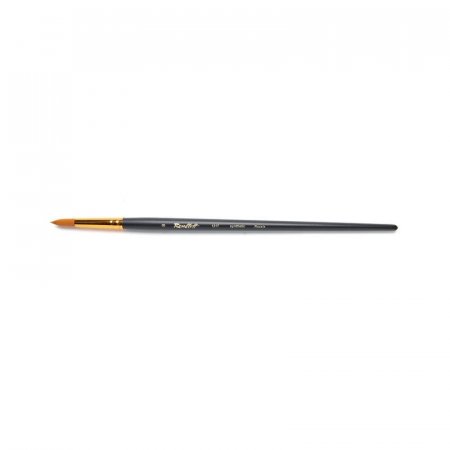 Кисть круглая из волоса рыжей жесткой синтетики с укороченной выставкой, обойма алюминиевая, анодированная, ручка длинная, черная, матовая. Номер кисти 8, для нанесения фона и больших деталей.