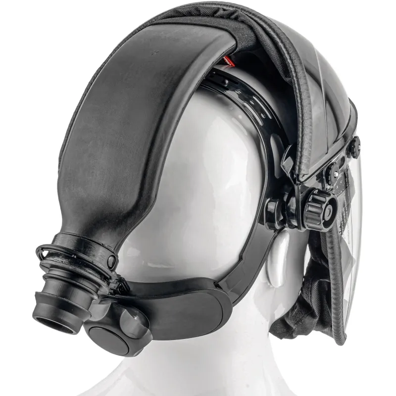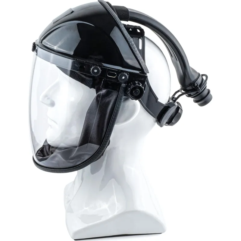 Щиток состоит из бесцветного защитного экрана c антиабразивным покрытием, козырька, наголовного крепления, тканевого лицевого уплотнителя, воздуховода с регулировкой направления подаваемого воздуха.