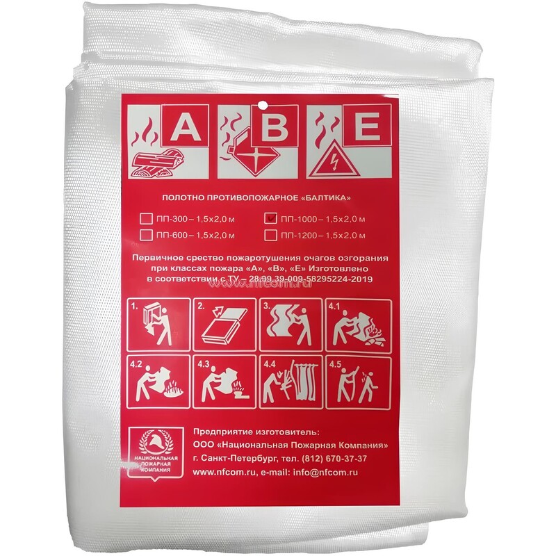 Полотно из стекловолоконной и базальтовой ткани предназначено для защиты от огня и высоких температур. Размер изделия составляет 1500×2000 мм, что позволяет перекрывать большую площадь. В сложенном состоянии размер изделия — 220×30×200 мм, что делает его компактным для хранения и удобным в транспортировке. Цвет полотна — белый.