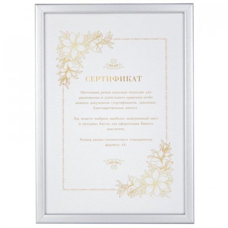 Рамка для сертификатов, фотографий и других материалов формата А4, оригинальный презент, красивый и функциональный элемент декора. Деревянный багет выполнен в серебряном цвете. Для защиты содержимого от загрязнения и повреждений предусмотрено стекло.