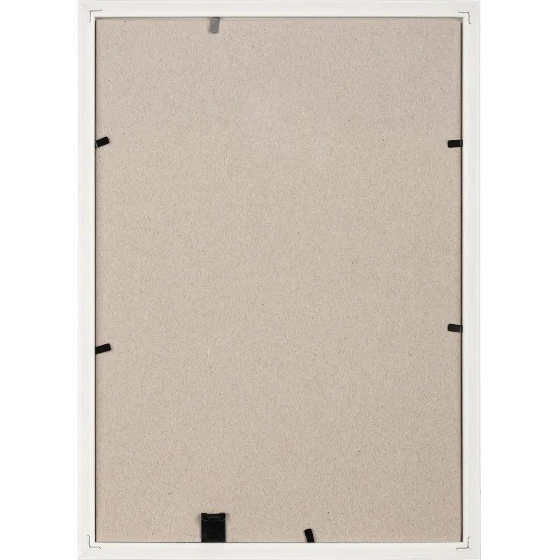 Рамка изготовлена из качественного пластикового профиля белого цвета, задника из переплетного картона и защитной несъемной вставки из пластикового стекла (ПЭТ). В комплекте металлические подвесы для горизонтального и вертикального размещения.