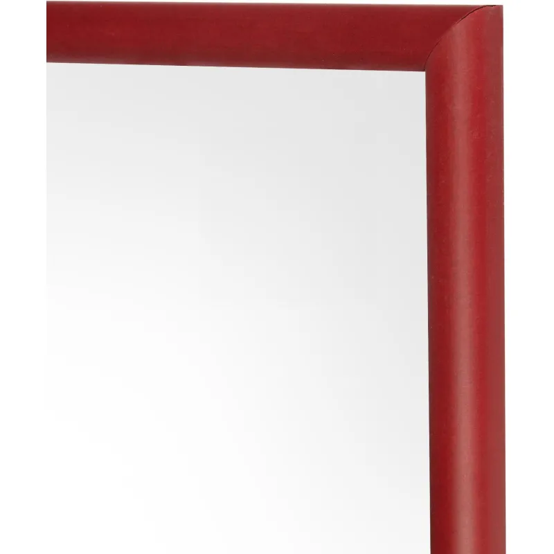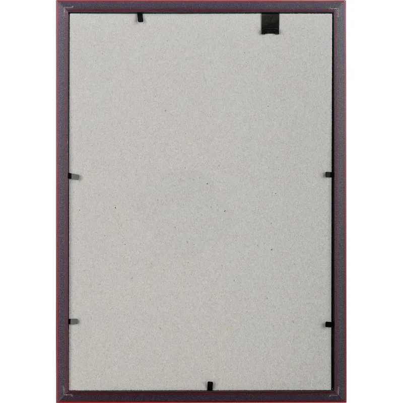 Рамка изготовлена из качественного пластикового профиля красного цвета, задника из переплетного картона и защитной несъемной вставки из пластикового стекла (ПЭТ). В комплекте металлические подвесы для горизонтального и вертикального размещения.