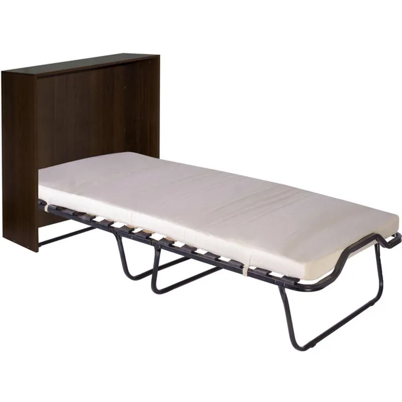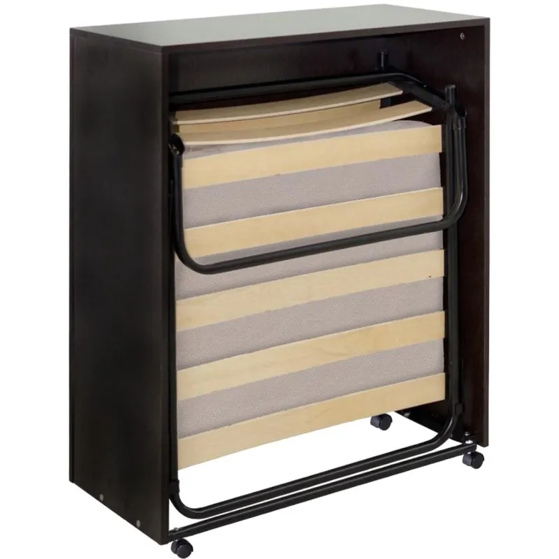 Кровать-тумба Карина раскладная — это альтернатива стационарной кровати и прикроватной тумбочки. Благодаря тумбочке вам всегда будет положить перед сном телефон, книгу и другие личные вещи. В собранном состоянии раскладная кровать не займет много места, вы всегда легко ее передвинуть в другое место, благодаря установленным колесикам. Дополнительным плюсом будет, то что, приставив к стене, вы получите небольшой столик. Комплектуется с матрасом. Размеры (ДхШхВ) 2110×853×1103 мм. Размеры в сложенном состоянии (ДхШхВ) 985×865×375 мм. Размер спального места (ДхШ) 1900×800 мм. Габариты тумбы (ДхШхВ) 821×354×936 мм. Допустимая нагрузка 200 кг. Вес изделия 36 кг. Основание спального места — ламели. Толщина матраса 80 мм. Наполнитель матраса холлкон. Материал чехла матраса ткань (полиэфир). Цвет каркаса — черный. Диаметр несущей трубы каркаса 25 мм. Материал каркаса сталь. Материал тумбы и комплектующих ЛДСП (2 мм) и пластик. Цвет изголовья — венге.