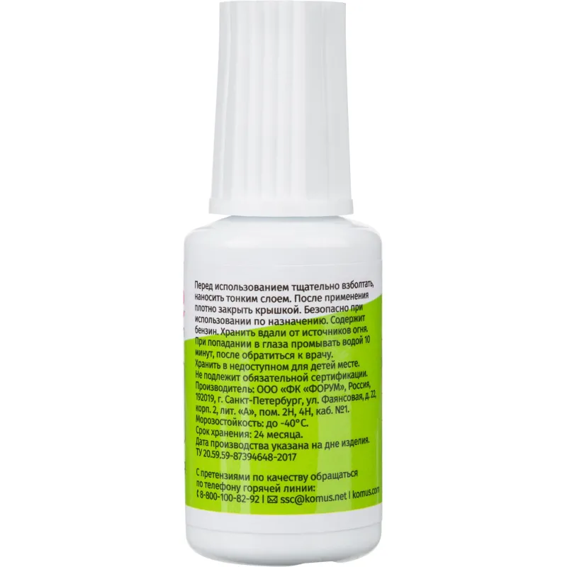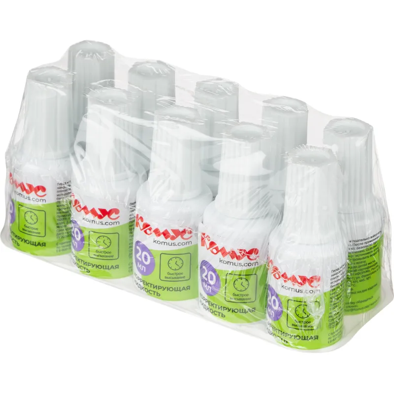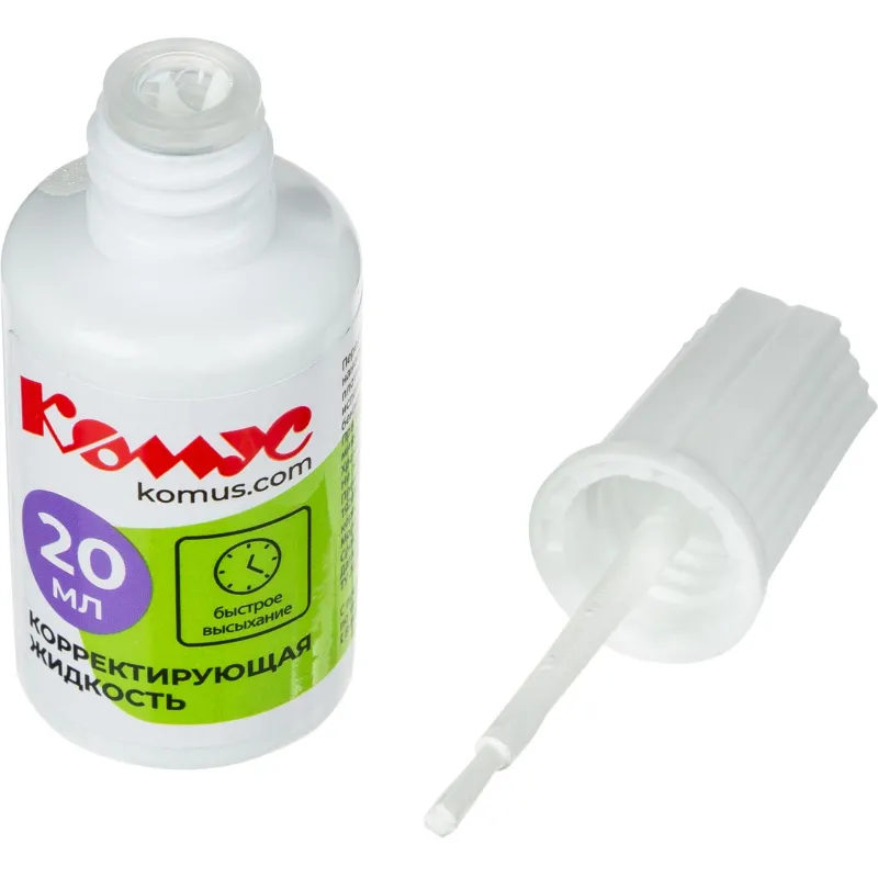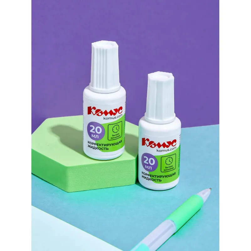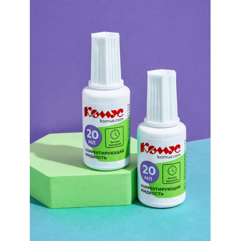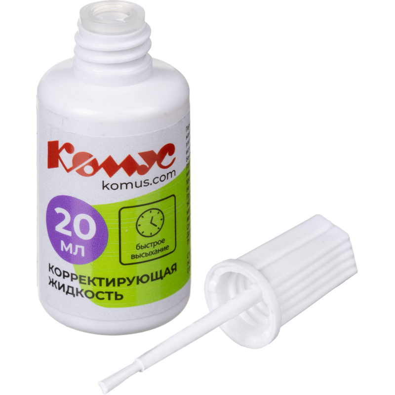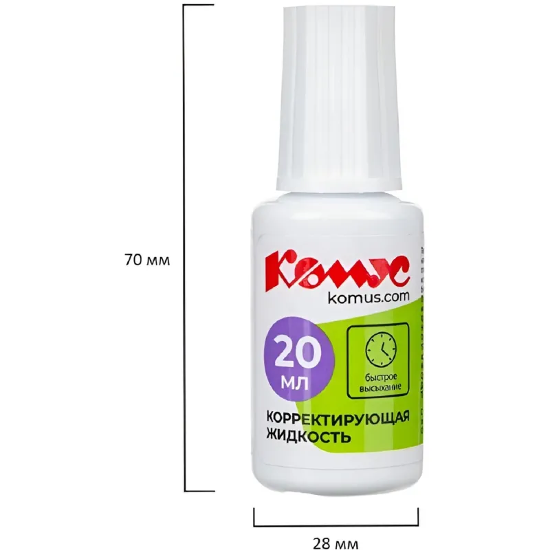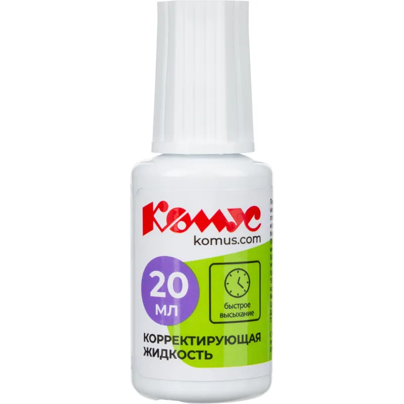 Корректирующая жидкость «Комус» применяется для корректировки всех типов документов, включая бумагу для факсов. Ложится ровным гладким слоем, создает непрозрачное покрытие. Имеет быстросохнущую основу. Во флаконе есть металлический шарик. Вид кисточки — ворс. Объем флакона с корректирующей жидкостью составляет 20 мл.