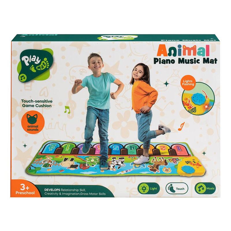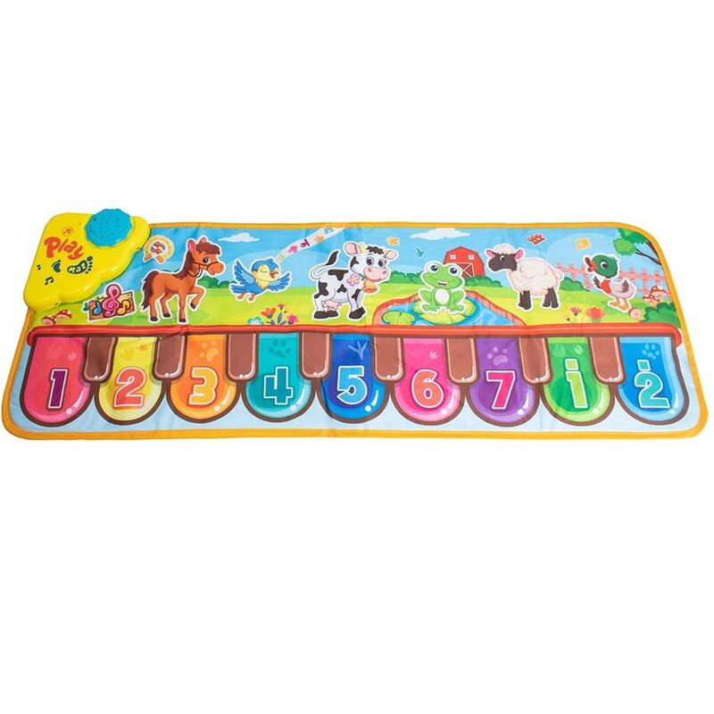 Пианино в форме коврика размером 85×30 см. Функционал: звуки клавиш пианино, звуки животных (лошадки, птички, коровы, лягушки, овечки, гуся), мелодии, регулировка уровня звука, световые эффекты. Посредством кнопки переключателя режимов можно менять звуки клавиш пианино на мелодии. По коврику можно активно ползать и прыгать по нотам. Игрушка способствует развитию творческого потенциала, помогает изучить ноты, цвета и животных. Функции регулировки уровня звука нет. Для работы необходимы 3 батарейки АА (в комплект не входят).