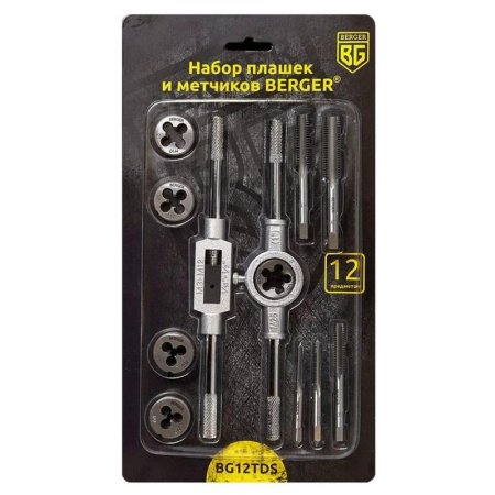 Набор плашек и метчиков 12 предметов BERGER. 5 шт. — плашка: М5×0,8; М6×1,0; М8×1,25; М10×1,5; М12×1,25 мм. 5 шт. — метчик однопроходной: М5×0,8; М6×1,0; М8×1,25; М10×1,5; М12×1,25 мм. 1 шт. — ключ для плашек 25×9. 1 шт. — ключ для метчиков М3-М12. Материал: легированная сталь 9XC (средняя твердость 61 HRC). Упаковка-блистер. Маркировка, нанесенная на блистерную упаковку облегчает идентификацию.