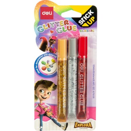 Глиттер гель DELI Explora с яркими цветными блестками придает эффект мерцания и превосходно подходит для декорирования рисунков, поздравительных открыток, иллюстраций, тетрадей, плакатов, игрушек, поделок, свечей и прочих изделий из различных материалов: бумаги, дерева, пластика, стекла, воска и т. д. Удобный наконечник для точного нанесения клея. Без растворителей. Легкосмываемый. Подходит для слаймов. Рекомендации по применению: перед началом работы снимите колпачок с тубы и нанесите гель на декорируемую поверхность. По окончании работы прочистите наконечники каждой тубы и плотно закройте колпачки. В течение трех часов основной состав геля высохнет, а на декорируемой поверхности останутся искрящиеся блестки. Время высыхания геля зависит от толщины нанесенного слоя. Берегите гель от замерзания. Гель легко смывается с рук и одежды теплой водой с мылом. В наборе 3 цвета. Для детей старше 3-х лет.Объем: 12 мл.