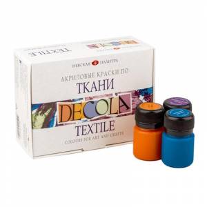 Акриловые краски Decola по ткани 12 штук по 20 мл предназначены для росписи хлопчатобумажных, шелковых и синтетических тканей. Предназначены для художественного оформления всех типов ткани. Применяются как для свободной росписи, так и для оформления ткани методом резервирования с использованием контура по ткани. Быстро сохнут. Закрепляются утюгом. После 48 часов после проглаживания утюгом допускается машинная стирка. Краски глубоко проникают в волокна ткани.