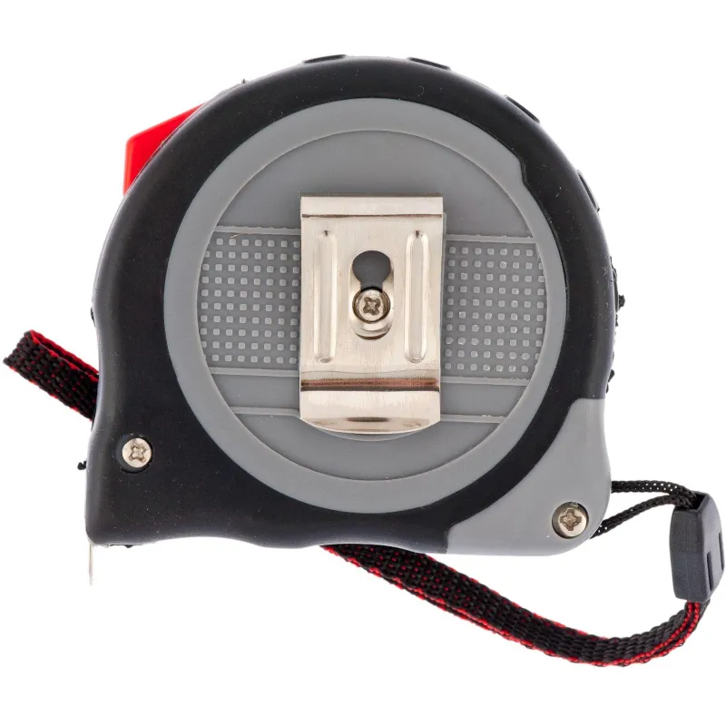 Рулетка оснащена ремешком из нейлона для фиксации рулетки на запястье и скобой для фиксации на ремне.
