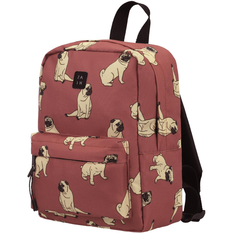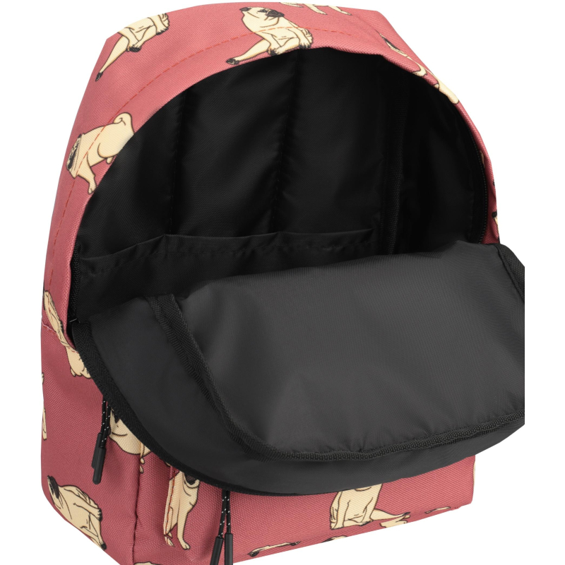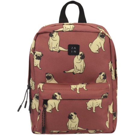 Оформление в коричневом цвете с принтом мопсов делает рюкзак привлекательным для девочек и мальчиков. Изделие имеет одно основное отделение, которое вмещает предметы формата А5, а также два кармана — внутренний и внешний. Регулируемые лямки позволяют адаптировать посадку рюкзака под рост ребёнка.