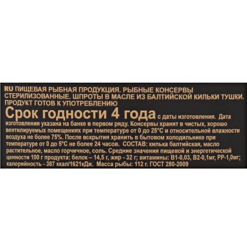 Шпроты За родину балтийские в масле, 160 г, с ключом для открывания.Состав: килька балтийская, масло подсолнечное, масло горчичное, соль.Средние значения пищевой и энергетической ценности 100 г продукта: белок — 14.5 г, жир — 32 г, витамины: В1 — 0.01 мг, В2 — 0.1 мг, РР — 1 мг, калорийность — 387 ккал/ 1621 к Дж.Консервы хранят в чистых, хорошо вентилируемых помещениях при температуре от 0 до 25 °С и относительной влажности воздуха не более 75%. Хранить в бытовом холодильнике после вскрытия при температуре от 0 до 6 °С не более 24 часов.Страна производства: Россия.Продукт готов к употреблению.