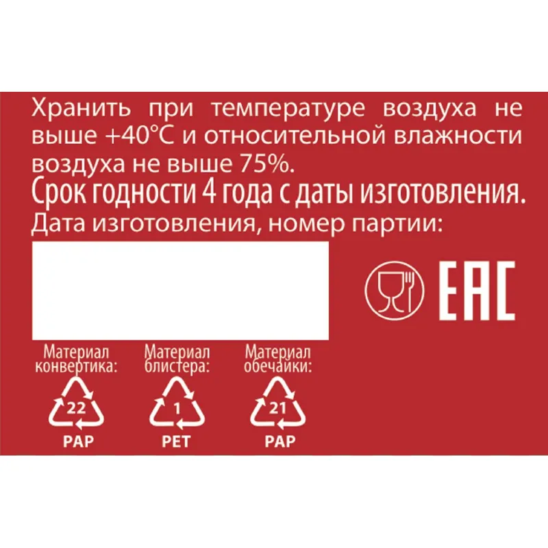 Условия хранения: хранить в сухом месте при температуре воздуха не выше +40’С и относительной влажности не выше 75%.