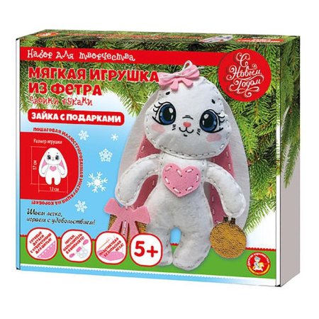 Мягкая игрушка из фетра «Зайка с подарками» — это набор для творчества, благодаря которому у ребенка появится возможность своими руками смастерить прелестную игрушку.Состав набора:— заготовки из фетра с перфорированными отверстиями— безопасная пластиковая иголка — 1 шт. (5 см)— наполнитель— ниткиРазмер готовой игрушки — 17?12 см. Набор предназначен для детей от 5 лет.Как шить игрушку?1. Сложите детали ручек вместе, сшейте их между собой и через оставленное отверстие набейте ручку наполнителем.2. Сшейте вторую ручку аналогично первой.3. Пришейте розовые детали к белым деталям ушек.4. Пришейте розовое сердечко к лицевой детали туловища.5. Сложите детали туловища вместе и сшейте их между собой, вставляя детали ручек между ними и совмещая нужные отверстия (выделены зеленым цветом).6. Через оставленное отверстие набейте туловище наполнителем.7. Сложите детали головы вместе и сшейте их между собой, вставив между ними готовое туловище и совмещая соответствующие отверстия.8. Приложите ушки сзади головы и прошейте их.9. Набейте голову наполнителем и пришейте бантик.10. Пришейте бант к подарку.11. Пришейте к лапкам зайки подарок и шарик.Ваша игрушка готова!Шить можно техникой «шов вперед иголку» или двойным швом «вперед иголку». Подробная инструкция изображена на обратной стороне упаковки.Набор для создания игрушки из цветного фетра отлично подходит для поделки в детский сад и в школу. Очаровательная мягкая фетровая игрушка станет приятным подарком для ваших близких.Создание игрушки своими руками способствует воспитанию усидчивости, развитию фантазии, творческого мышления, мелкой моторики и навыков шитья.