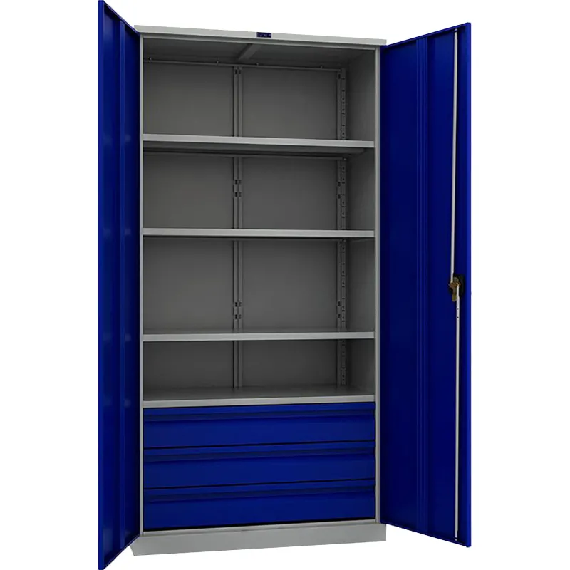 Шкаф инструментальный Практик TC-1995-004030 950×500×1900 мм. Шкаф инструментальный предназначен для хранения инструментов, слесарных приспособлений и других изделий на предприятиях, в мастерских и автосервисах. Сертифицирован в соответствии с ГОСТ 16371. Возможность индивидуальной комплектации — выбор необходимых комплектующих и их расположения. Ригели из оцинкованной стали и пластиковые втулки обеспечивает бесшумный ход дверей и надёжное запирание. Комплектуется ключевыми замками Cyberlock с 2000 комбинациями, в комплекте 2 ключа. Толщина стали корпуса и дверей — 0,8 мм. Максимальная нагрузка на шкаф — 500 кг. Максимальная нагрузка на полку — 80 кг. Шаг регулировки высоты полки — 50 мм. Поставляется в разобранном виде.