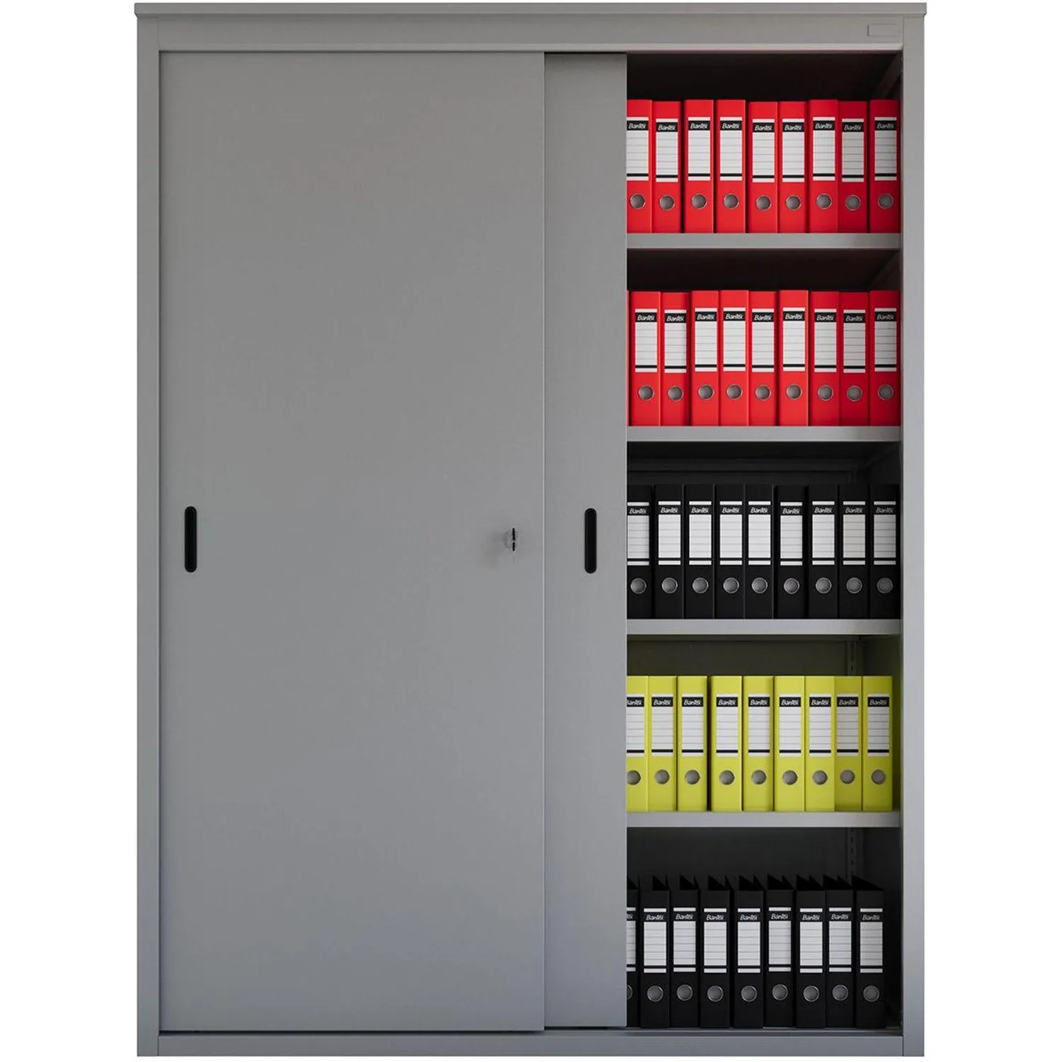 Шкаф-купе металлический архивный Металл-Завод Металл-Завод AL2015 предназначен для хранения больших объёмов документации, хозяйственных товаров, офисной, торговой и бытовой техники в государственных и частных учреждениях, на производстве. Металлический шкаф серии AL идеально подходит для помещений, комнат с дефицитом площадей, для коридоров и узких проходов, поскольку не требует дополнительного пространства при открывании дверей, позволяет рационально использовать площади помещений. Сборно-разборный шкаф представляет собой изделие с односекционным корпусом с двумя раздвижными дверьми-купе.
