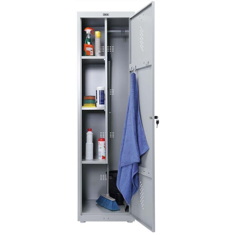 Предназначен для хранения одежды и уборочного инвентаря.— способ сборки: зацепы и саморезы (крепеж в комплекте). — ключевой замок «Практик» (2000 комбинаций). — вентиляционные отверстия. — конструкция шкафов позволяет скреплять их между собой. — возможность установки двери с правым или левым открыванием (по желанию заказчик изменяет направление открывания двери). — комплектация: полки, перекладина, крючки. — поставляются в разобранном виде. — опции (под заказ): замком PLxxx (вместо ключевого замка устанавливается бесключевой замок Euro-locks A129 с устройством под навесной замок), кодовый механический или кодовый электронный (по запросу), для камер хранения или фитнес центров; полка под обувь, подставка или скамья-подставка под шкаф, наклонная крыша. Окраска дверей в цвет по RAL.Изображения товаров на сайте не могут гарантировать точную цветопередачу.
