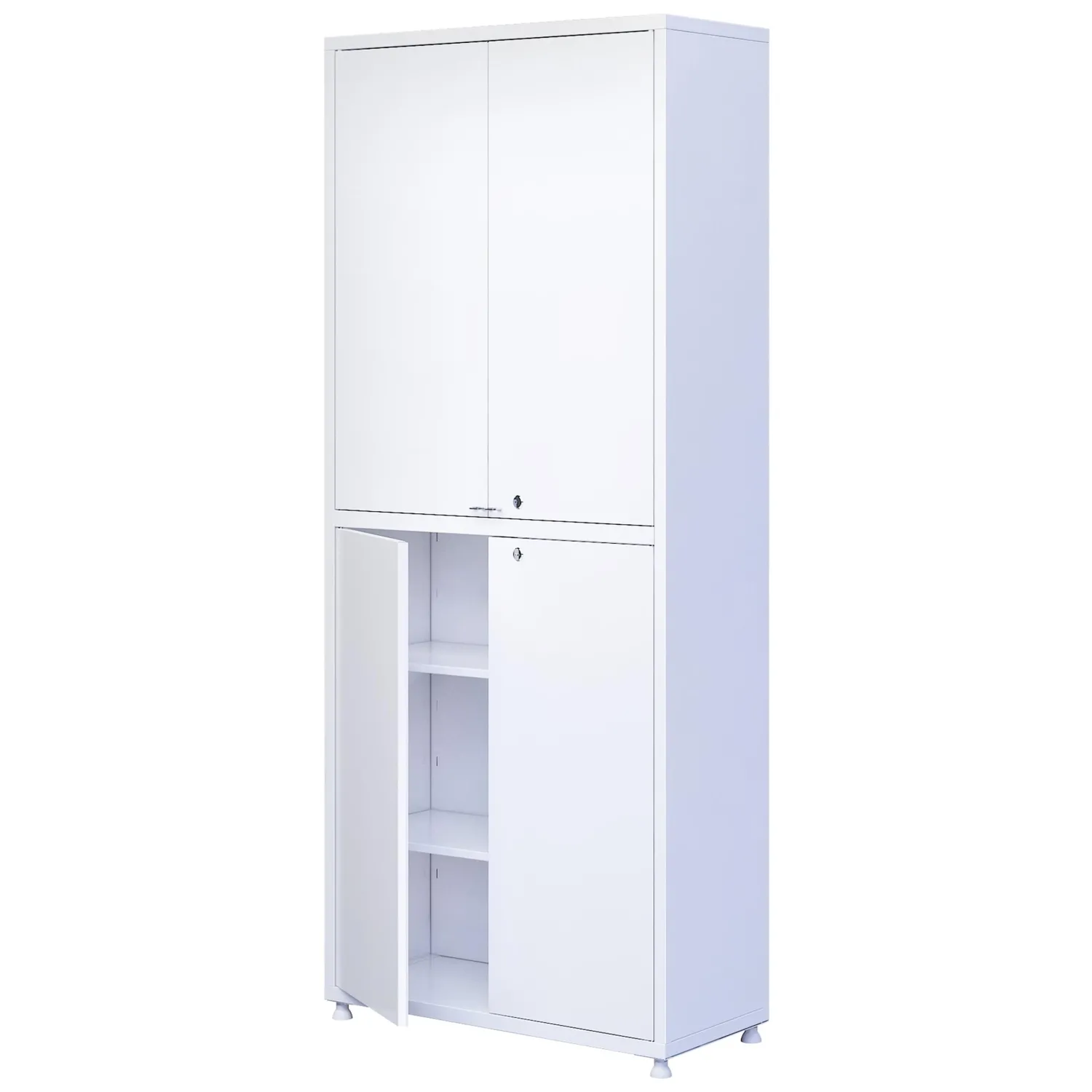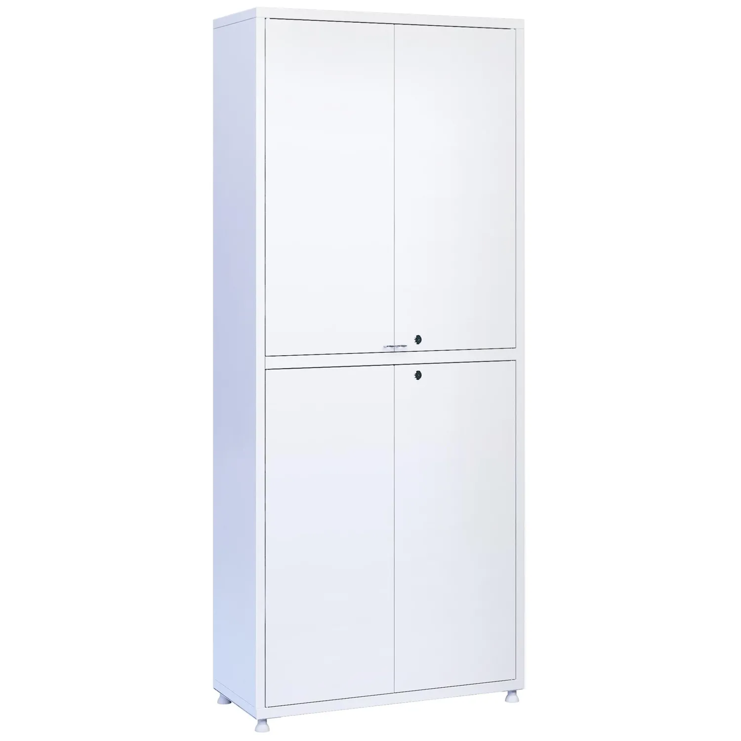 Шкаф медицинский предназначен для размещения и хранения лекарственных средств, перевязочных материалов, инструментов, медицинских расходных материалов и других изделий медицинского назначения. Шкаф медицинский является необходимой частью оснащёния смотровых, процедурных, перевязочных кабинетов, постов медицинских сестер, реанимационных палат и операционных блоков лечебно-профилактических учреждений. Производится по единой технологии в виде жесткой двух-объёмной модульной сборно-разборной конструкции, которая состоит из металлических панелей, изготовленных из листовой углеродистой стали, составляющих каркас (стенки и короба) шкафов, а также дверей и полок. Двери металлические оснащёны вертикальным П-образным усилителем, придающим им жесткость. Оси дверей вставляются в отверстия в горизонтальных коробах при сборке шкафа, а наличие втулок из ПВХ исключает люфт и смягчают работу дверей. Правые двери снабжены врезными мебельными замками с комплектом ключей, левые — магнитными защелками. Полки металлические (две пары) устанавливаются на универсальные металлические пластинчатые полкодержатели. Шаг отверстий для установки полкодержателей — 120 мм, в верхней секции предусмотрено пять уровней высоты для полок, в нижней секции — четыре уровня. Покрытие всех металлических деталей шкафа выполнено экологически чистой эпоксидной полимерно-порошковой краской, устойчивой к ударам, сколам и регулярной обработке всеми видами медицинских моющих и дезинфицирующих растворов. Двери открываются и закрываются свободно, без заедания и перекосов. Поставляется в разобранном виде и собирается на винтах без применения специального инструмента. Товар имеет регистрационное удостоверение Росздравнадзора на медицинское изделие.