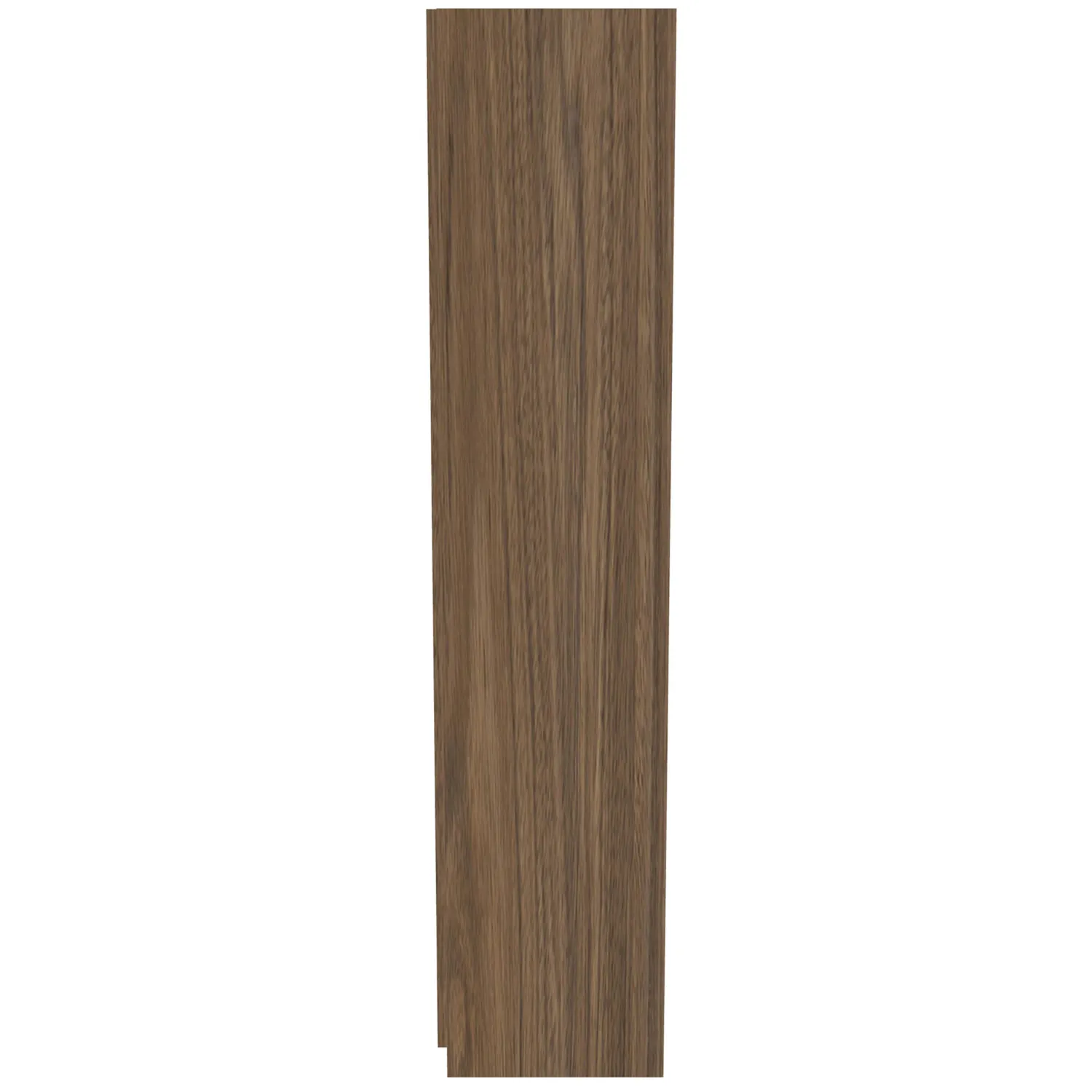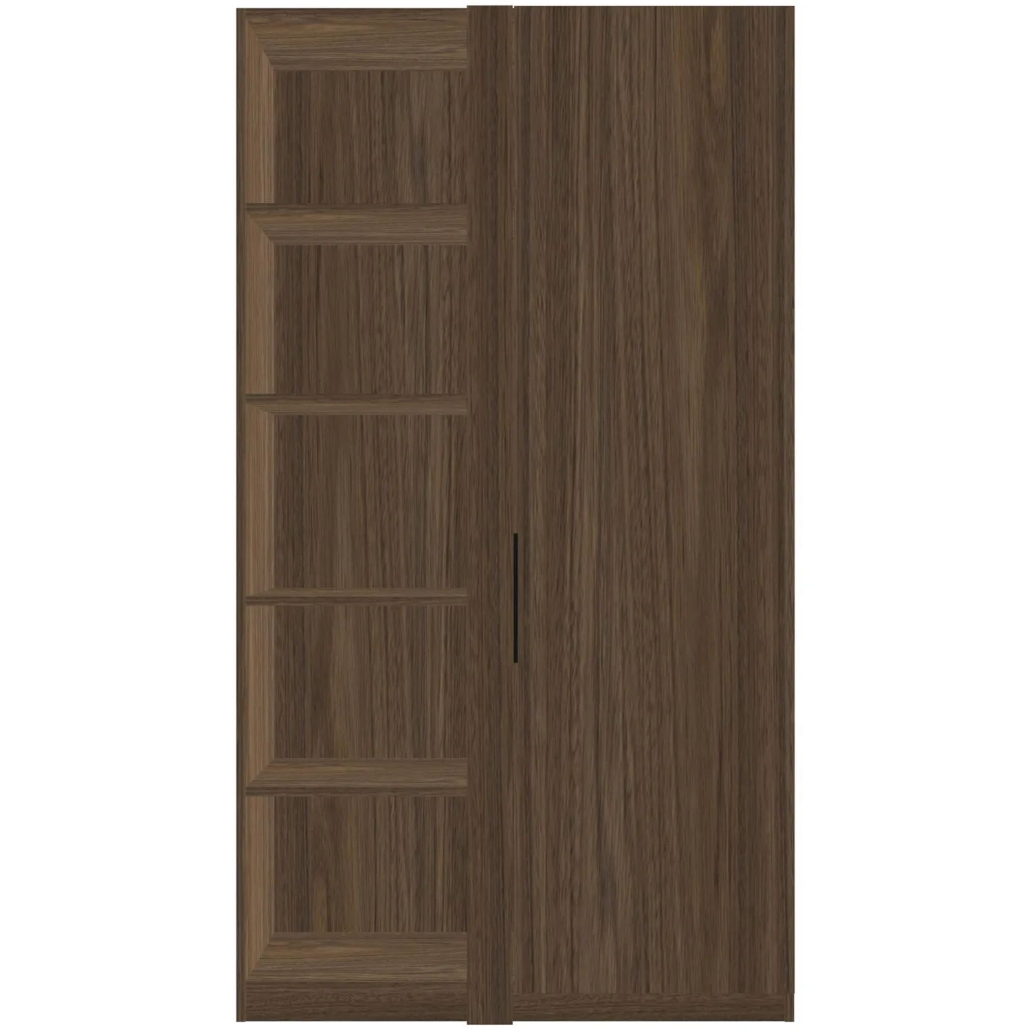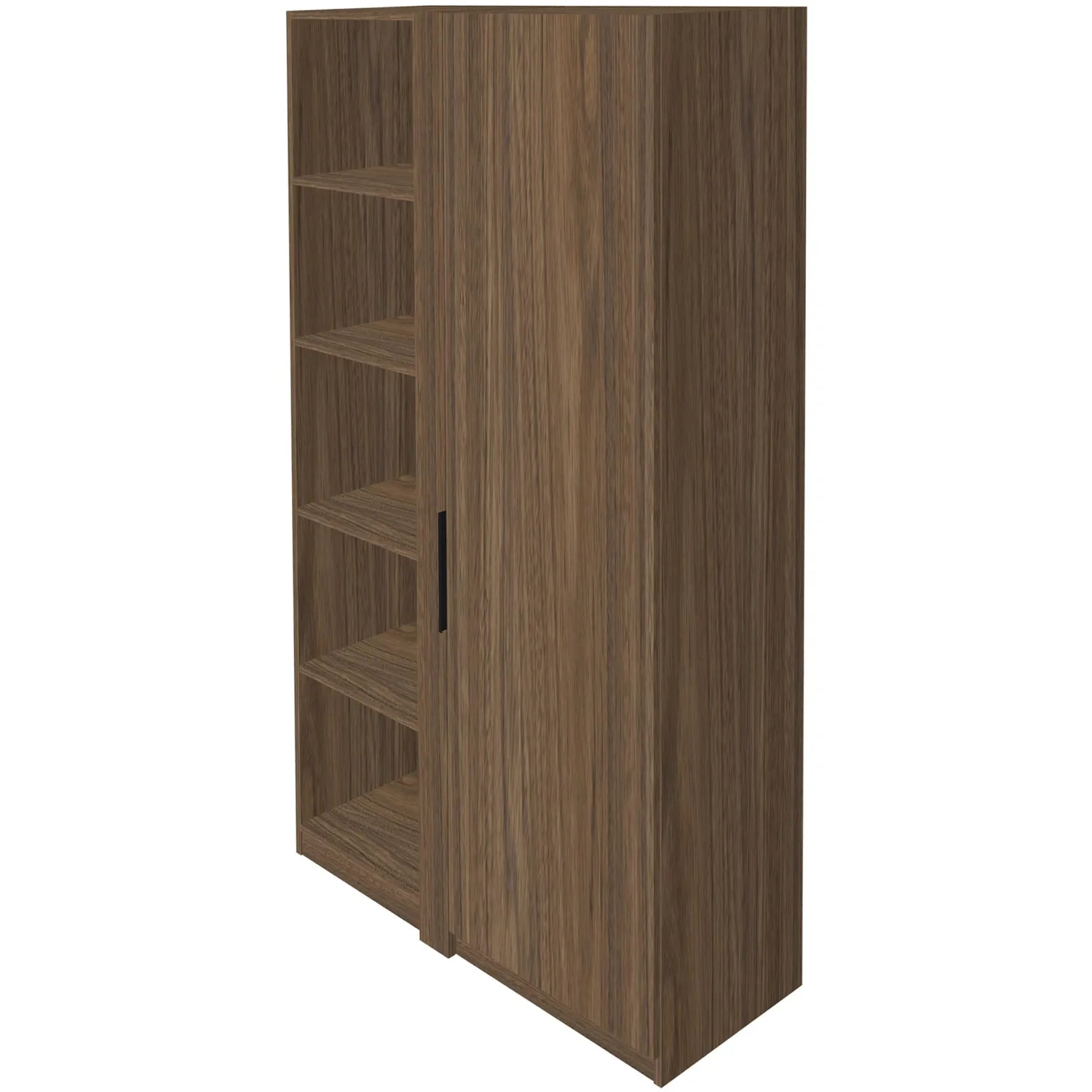 Стеллаж состоит из двух разноширинных секций, объединённых центральным коробом. Стеллаж оснащён гардеробным отделением со стационарной полкой для головных уборов и выдвижной штангой для одежды. Гардеробное отделение закрыто распашным фасадом, установленным на регулируемые петли со встроенной системой плавного закрывания (не менее четырёх петель). Лицевая фурнитура — металлическая, профильного типа, цвет чёрный матовый. Конструкция стеллажа позволяет выбрать расположение гардеробного отделения при монтаже: с правой или левой стороны.Помимо гардеробного отделения, стеллаж оснащён узкой открытой секцией для хранения документации. Внутреннее пространство секции разделено четырьмя стационарными полками. Боковина открытой секции стеллажа имеет присадку (отверстия) для возможности доукомплектации стеклянными или глухими дверьми. Дополнительная дверь к шкафу — арт. 1180113.