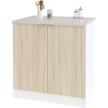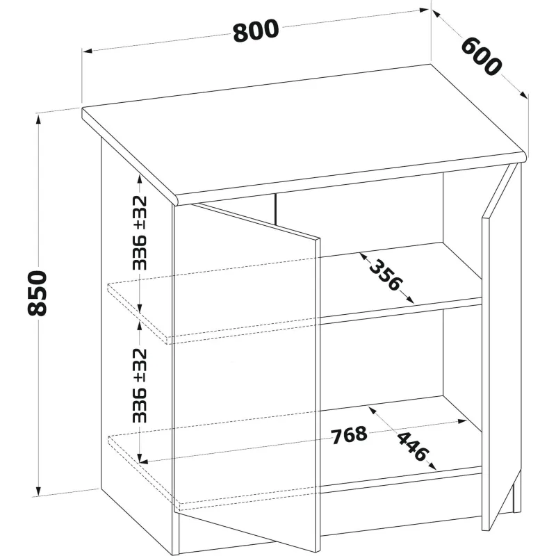 Кухонная тумба со столешницей и полкой внутри. Ручки на фасадах сделаны из металла. Высота столешницы — 26 мм. Тумба сделана из ЛДСП 16 мм, края оформлены кромкой ПВХ 0,4 мм. Столешница — ЛДСП с влагостойким прочным покрытием постформинг.