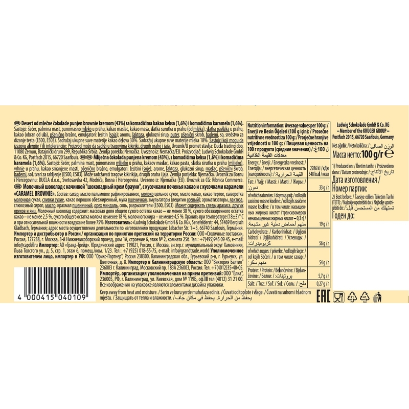 Состав: молочный шоколад (сахар, масло какао, молоко цельное сухое, какао тертое, экстракт ванили), начинка «шоколадный крем брауни» (сахар, жир растительный (жир пальмовый, жир кокосовый), сливки сухие, сыворотка молочная сухая, какао порошок обезжиренный, мука пшеничная, масло сливочное, глюкозный сироп, ароматизаторы, крахмал пшеничный, лактоза, орех миндаля, соль, разрыхлители (е500, е503)).