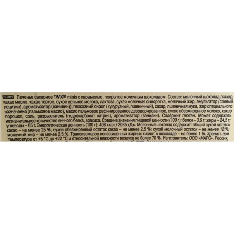 Шоколадные батончики Twix мини 2,7 кг — это батончики, созданные из хрустящего песочного печенья, слоя мягкой карамели и нежного молочного шоколада. Мини варианты Twix внешне похожи на обычную шоколадную конфету, но являются точной копией полюбившегося лакомства. Вкусные конфетки небольшого размера можно брать с собой на работу или в гости, а также давать ребенку в школу и на дополнительные занятия. Ими проще делиться и угощать многочисленных друзей, собираясь за вкусным чаепитием в офисных или домашних стенах. Состав: молочный шоколад (общий сухой остаток какао — не менее 26%): сахар, какао-масло, какао тертое, лактоза, сухое цельное молоко, сухая молочная сыворотка, молочный жир, эмульгатор (соевый лецитин), ароматизатор (ванилин), карамель, глюкозный сироп (кукурузный, пшеничный), сахар, масло пальмовое рафинированное, сухое обезжиренное молоко, соль, ароматизатор (ванилин), печенье, пшеничная мука, жир специального назначения, сахар, какао-порошок обезжиренный, соль, разрыхлитель (гидрокарбонат натрия), ароматизатор (ванилин). Пищевая ценность: белки — 3,9 г, углеводы — 65 г, жиры — 24,5 г.