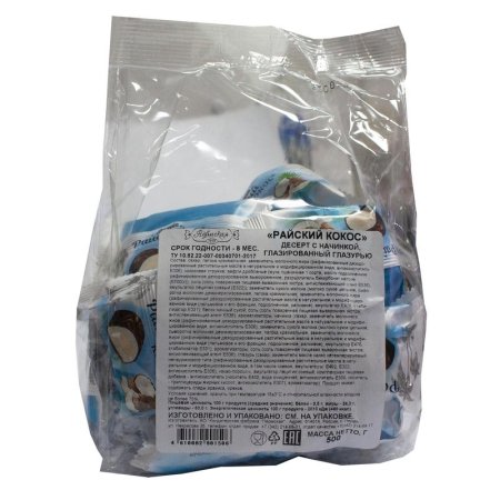Легкий, воздушный десерт с начинкой из натуральной кокосовой стружки, покрытый тонким слоем нежной глазури. Упаковка флоупак позволяет длительное время сохранять свежесть и аромат продукта. Состав: сахар; патока крахмальная; заменитель молочного жира (рафинированные дезодорированные растительные масла в натуральном и модифицированном виде, антиокислитель Е306); кокосовая стружка; вафли дробленые (мука пшеничная 1 сорта, масло подсолнечное рафинированное дезодорированное вымороженное, разрыхлитель Е500(ii); соль (соль поваренная пищевая выварочная экстра, антислеживающий агент Е536), эмульгатор лецитин соевый); заменитель сухого молока (молоко сухое цельное, сыворотка молочная деминерализованная, патока крахмальная, заменитель молочного жира (рафинированные дезодорированные растительные масла в натуральном и модифицированном виде (пальмовое и его фракции, подсолнечное, рапсовое), эмульгатор Е476, стабилизатор Е331); белок яичный сухой; соль (соль поваренная пищевая выварочная экстра, антислеживающий агент Е536); ароматизаторы: 'Кокос', ванилин; начинка (сахар; заменитель молочного жира (рафинированные дезодорированные растительные масла в натуральном и модифицированном виде, антиокислитель Е306); заменитель сухого молока (молоко сухое цельное, сыворотка молочная деминерализованная, патока крахмальная, заменитель молочного жира (рафинированные дезодорированные растительные масла в натуральном и модифицированном виде (пальмовое и его фракции, подсолнечное, рапсовое), эмульгатор Е476, стабилизатор Е331); ароматизаторы: 'Кокос', ванилин; соль (соль поваренная пищевая выварочная экстра, антислеживающий агент Е536); глазурь (сахар; заменитель масла какао нетемперируемый нелауринового типа (рафинированные дезодорированные растительные масла в натуральном и модифицированном виде, в том числе соевое, эмульгаторы: Е492, Е322, антиокислитель Е306); какао-порошок; эмульгатор лецитин соевый; комплексная пищевая добавка — антиокислитель (носитель Е432, вода очищенная, антиокислитель Е300, носитель — триглицериды жирных кислот, антиокислитель Е307); ароматизатор ванилин). Пищевая ценность: белки — 3,5 г, жиры — 24 г, углеводы — 63 г. Энергетическая ценность: 2010 кДж, 480 ккал. Срок годности: 8 месяцев. Условия хранения: при влажности не более 75%, температура от 15°С до 21°С. Масса нетто: 500 г. Производитель: АО «Кондитерская фабрика «Пермская», Россия