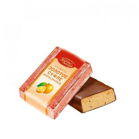 Жемчужина коллекции 'Золотое суфле' от фабрики 'Красный Октябрь'. Нежное, тающее суфле с легкой цитрусовой кислинкой во вкусе, ярким апельсиновым ароматом, который переплетается с утонченными коньячными оттенками. Суфле покрыто хрусткой шоколадной глазурью и упаковано в блестящий фантик с бумажной перетяжкой, на которой изображены плоды апельсиновых деревьев.