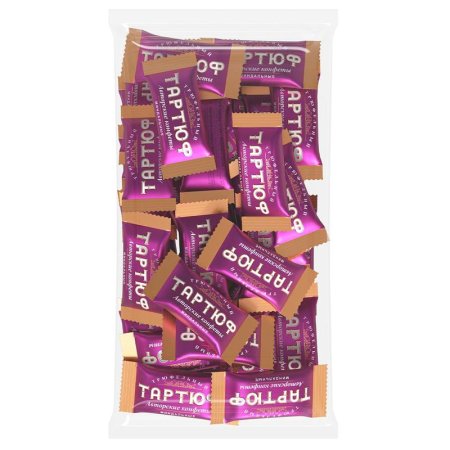 Конфеты Тартюф — прямые потомки парижского десерта tartufe, популярного в начале XX века. В основе рецепта «Тартюф» — трюфельная масса и французское печенье. Хрустящее и мягкое интересно сочетаются в текстуре конфет. Калифорнийский миндаль добавил во вкусовую гамму ореховую ноту. Состав: печенье сахарное (мука пшеничная хлебопекарная высший сорт, сахар, жир растительный, соль, разрыхлители (гидрокарбонат натрия, гидрокарбоант аммония), эмульгатор (лецитин соевый), регулятор кислотности — кислота лимонная, ароматизатор «Ванилин»), начинка жировая (сахар, кокосовое масло рафинированное дезодорированное, заменитель масла какао нетемперируемый лауринового типа (пальмоядровое масло, эмульгатор (лецитин соевый, Е492)), какао-порошок, лактоза, сухая молочная сыворотка, ароматизатор), глазурь кондитерская (сахар, заменитель какао-масла лауринового типа, какао-порошок, эмульгатор (лецитин соевый, Е476), ароматизатор пищевой «Ванилин», «Шоколад»), миндаль жареный дробленый, ароматизатор «Ореховый». Продукт содержит глютен пшеницы и продукты переработки молока. Может содержать следы сои, орехов и арахиса.Пищевая ценность в 100 г продукта (средние значения): белки — 6,0 г; жиры — 26,0 г; углеводы — 60,0 г.Энергетическая ценность в 100 г: 470 ккал, 1970 кДж. Срок годности: 9 месяцев. Хранить при температуре от +5°C до +22°C и относительной влажности воздуха не более 70%. Не подвергать воздействию прямого солнечного света. Масса нетто: 500 г. Страна производства: Россия.Производитель: ООО «Собрание»