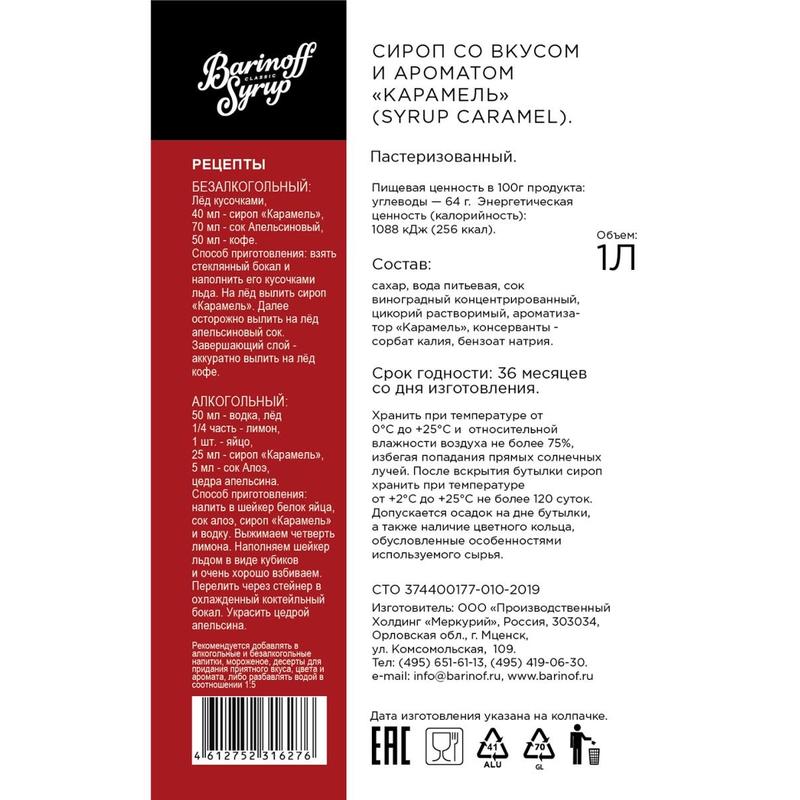 «Традиционный для бармена и совершенно необходимый ингредиент карамельный сироп Barinoff. Карамельный сироп густой, янтарный, ароматный must have на профессиональной кухне. Карамельный сироп часто используется для ароматизации пирогов, мороженого, пудингов и конфет. Он идеально подходит в качестве основы безалкогольных и алкогольных коктейлей и десертных напитков. Сироп карамель добавляют в смузи, шейки, лимонад, газировки и компоты. Отдельно хочется отметить кофе, который приобретает новые нюансы с добавлением этого сиропа. Сироп со вкусом карамели добавит изысканности горячему и холодному кофе, латте, мокко и другим видам бодрящего напитка. Можно использовать как топпинг для творога и каши.Хранить при температуре от 0 до +25 градусов, с относительной температурой влажности не более 75%.Для сиропа подходят дозаторы диаметром 31 мм.Состав: калия сорбат, сахар, натрия бензоат, вода питьевая, ароматизатор, цикория обыкновенного экстракт, сок концентрированный.Пищевая ценность: 64 углевода на 100 г.Энергетическая ценность: 256 ккал на 100 г.Срок годности: 36 месяцев.Страна производства: Россия.»