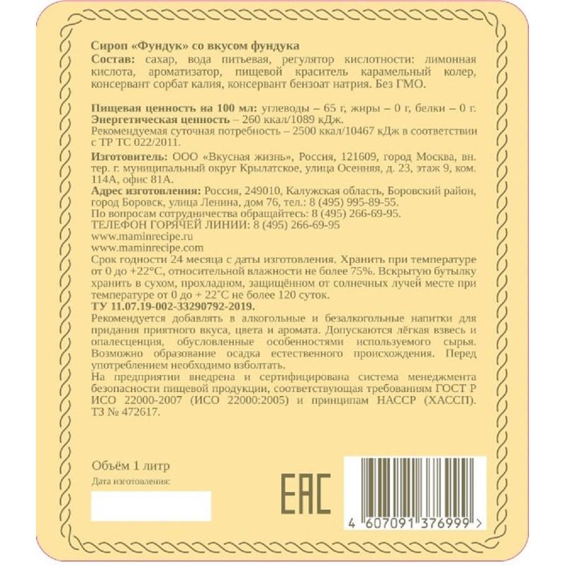 Сироп со вкусом фундука — это качественный высококонцентрированный продукт, способный поразить своими органолептическими свойствами даже самых заядлых гурманов. Он сладкий, но при этом в нем нет и намека на приторность. Его благородный вкус дополнит любое кулинарное изделие или напиток, а изысканный аромат усилит ощущение от дегустации. Добавьте лесную нотку в ваши любимые коктейли. Ну и конечно, по достоинству оценят этот сироп любители кофе.Состав: сахар, вода питьевая, регулятор кислотности: лимонная кислота, ароматизатор, консервант сорбат калия, консервант бензоат натрия, пищевой краситель карамельный колер. Без ГМО.Пищевая ценность на 100 мл; углеводы — 65 г, жиры — 0 г, белки — 0 г.Энергетическая ценность: 260 ккал.Срок хранения: 24 месяца.Хранить при температуре от 0 до 22˚С, относительной влажности не более 75%.После вскрытия хранить в сухом, прохладном месте не более 120 суток.Объем: 1000 мл.Страна производителя: Россия