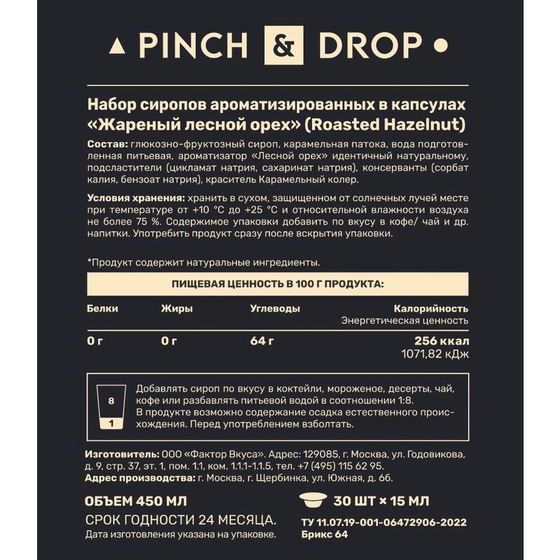 Сироп Pinch&Drop 'Лесной Орех' обладает насыщенным вкусом жареного лесного ореха, с оттенком сладости и тонкой шоколадной ноткой. Это один из самых популярных кофейных сиропов, т. к. он идеален для кофейных напитков, таких как латте, капучино или раф. Но этим не ограничивается область его использования: помимо кофе, сироп 'Лесной Орех' отлично сочетается с ингредиентами милкшейков, десертных коктейлей и выпечки! Состав: Глюкозно-фруктозный сироп, карамельная патока, вода подготовленная питьевая, ароматизатор 'Лесной орех' идентичный натуральному, подсластители (цикламат натрия, сахаринат натрия), консерванты (сорбат калия, бензоат натрия), краситель Карамельный колер.Пищевая ценность на 100 г продукта: углеводы — 55 г.Энергетическая ценность на 100 г продукта: 231 ккалУсловия хранения: Хранить в сухом, защищенном от солнечных лучей месте при t°от 10°С до 25°С и относительной влажности воздуха не более 75%. После вскрытия бутылки хранить не более 3-х месяцев при соблюдении условий хранения. Срок годности: 30 месяцев с даты изготовления.Вес: 450 мл (30 штук по 15 мл)Страна производства: Россия.