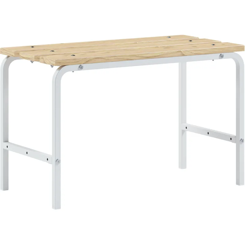 Скамья для раздевалок Металл-Завод может использоваться для удобства посетителей в гардеробных комнатах и раздевалках, а также для создания уюта и комфорта в помещениях, оборудованных для раздевания и приёма посетителей. Каркас скамьи выполнен из профильной трубы и окрашен импортной порошковой краской. Верх скамьи изготовлен из сосны.