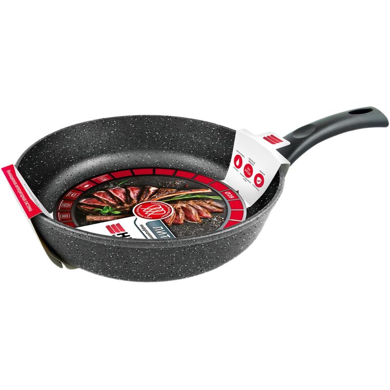Сковорода антипригарная литая 28см индукция Гранит ТМ НМП подходит для повседневного использования. Литой алюминиевый корпус обеспечивает равномерный нагрев и не подвержен деформации со временем. Многослойное антипригарное покрытие с эффектом натурального камня позволяет готовить с минимальным количеством масла, сохраняя натуральный вкус продуктов. Это очень удобно и позволяет сохранить полезные свойства блюд. Сковорода выполнена по технологии ’Full Induction’, оснащена ферромагнитным диском для быстрого разогрева на всех типах индукционных плит. Таким образом, вы сможете быстро подготовиться к жарке и начать готовить любимые блюда без лишних затрат времени. Эргономичная ручка из бакелита не нагревается в процессе приготовления, что обеспечивает комфорт и безопасность в использовании сковороды. Этот предотвращает возможные ожоги. Внешний вид и/или характеристики товара могут быть изменены производителем в соответствии с производственным процессом.