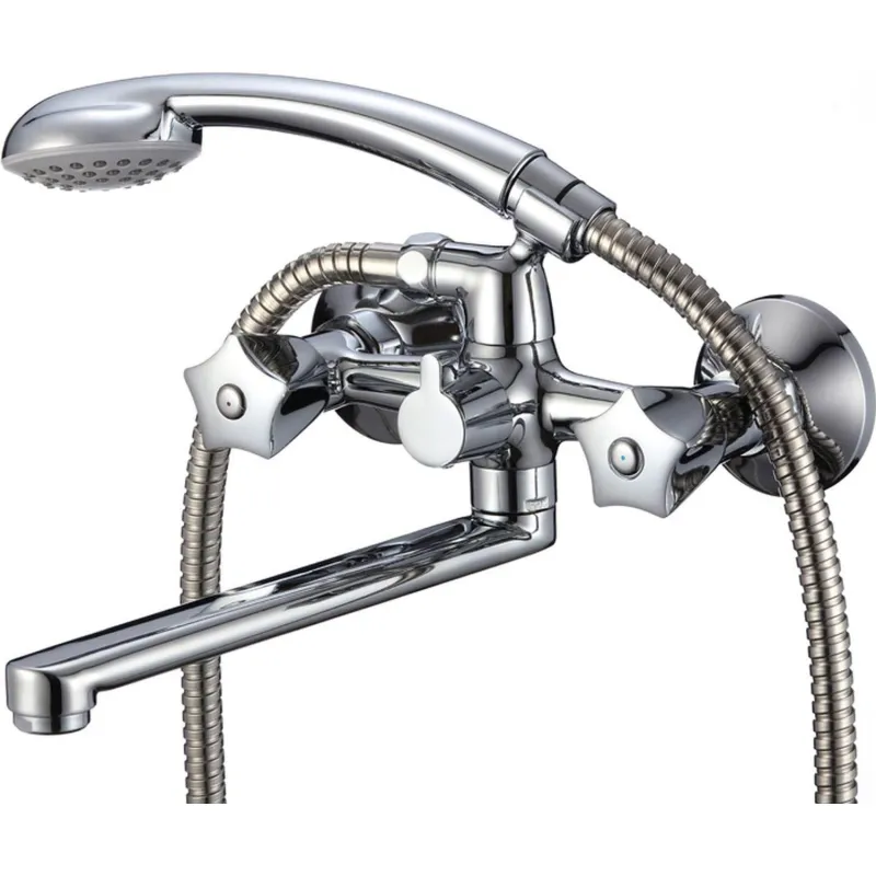 Смеситель для ванны. Латунный корпус из высококачественного сплава, двухслойное никель-хромовое покрытие - позволяют увеличить срок службы изделия до 25 лет. Пластиковый аэратор увеличенной проходимости позволяет быстро наполнить ванну. Кран-буксы со вставками - защита ручек смесителя от перегрева. Керамический дивертор с углом поворота 90 - быстрое переключение ванна/душ и гарантия надежности. Смеситель комплектуется душевыми аксессуарами, в том числе дополнительным держателем лейки.