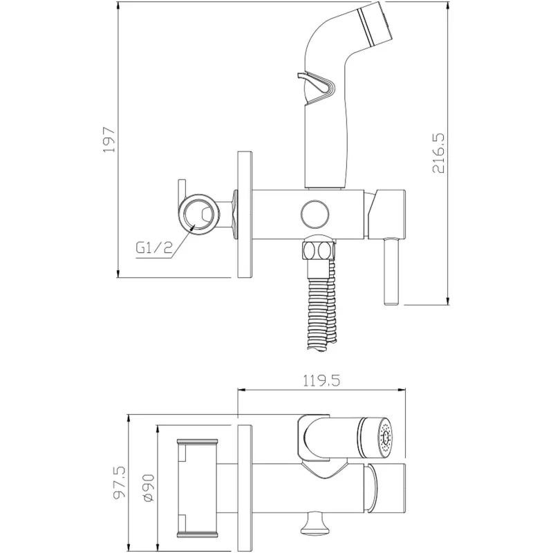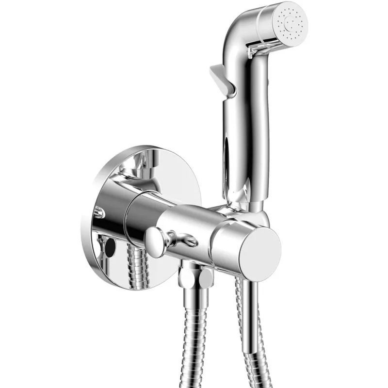 Смеситель современный встраиваемый настенного монтажа с гигиенической лейкой. Корпус из высококачественной латуни и двухслойное никель-хромовое покрытие - позволяют увеличить срок службы изделия до 25 лет. Смеситель комплектуется душевыми аксессуарами: однорежимная гигиеническая лейка, душевой шланг с защитой от перекручивания.