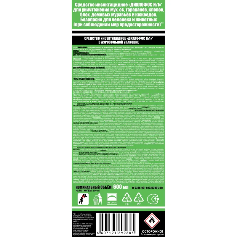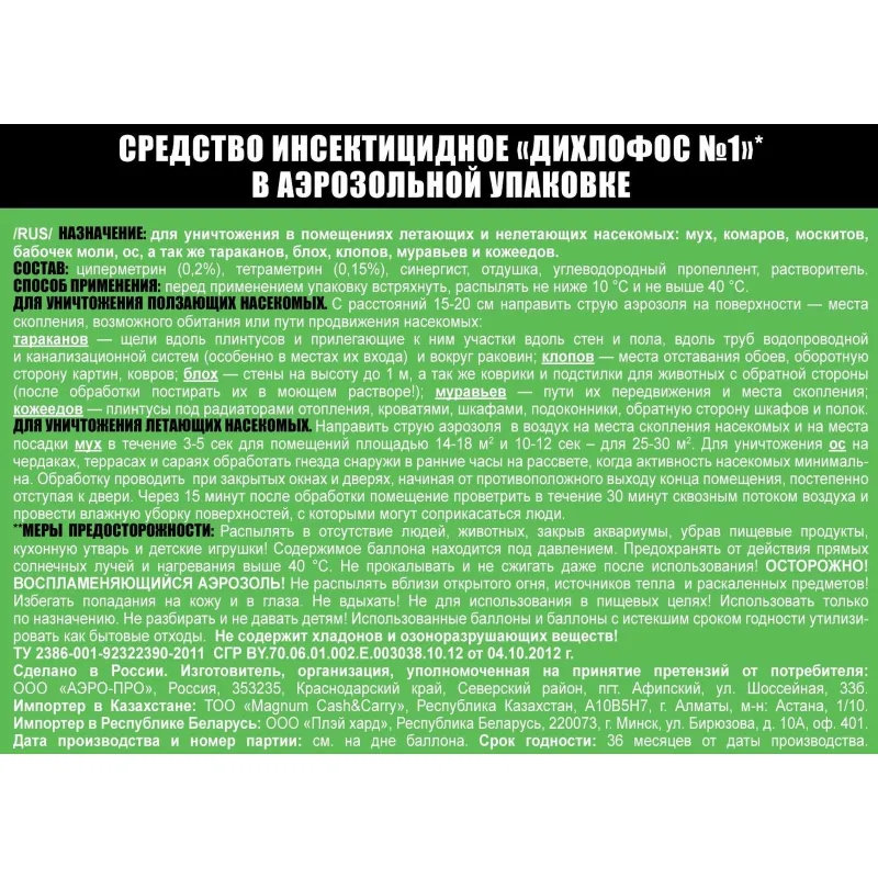 Меры предосторожности: Распылять в отсутствие людей и животных, предварительно закрыв аквариумы, убрав пищевые продукты, кухонную утварь и детские игрушки. Содержимое баллона находится под давлением. При нагревании возможен взрыв. Не прокалывать и не сжигать, даже после использования! Не распылять вблизи открытого огня, источников тепла и раскалённых предметов. Предохранять от действия прямых солнечных лучей и нагревания выше +40°C. Избегать попадания на кожу и в глаза. Не вдыхать аэрозоль! Не использовать в пищевых целях. Применять только по назначению.
