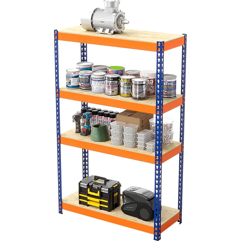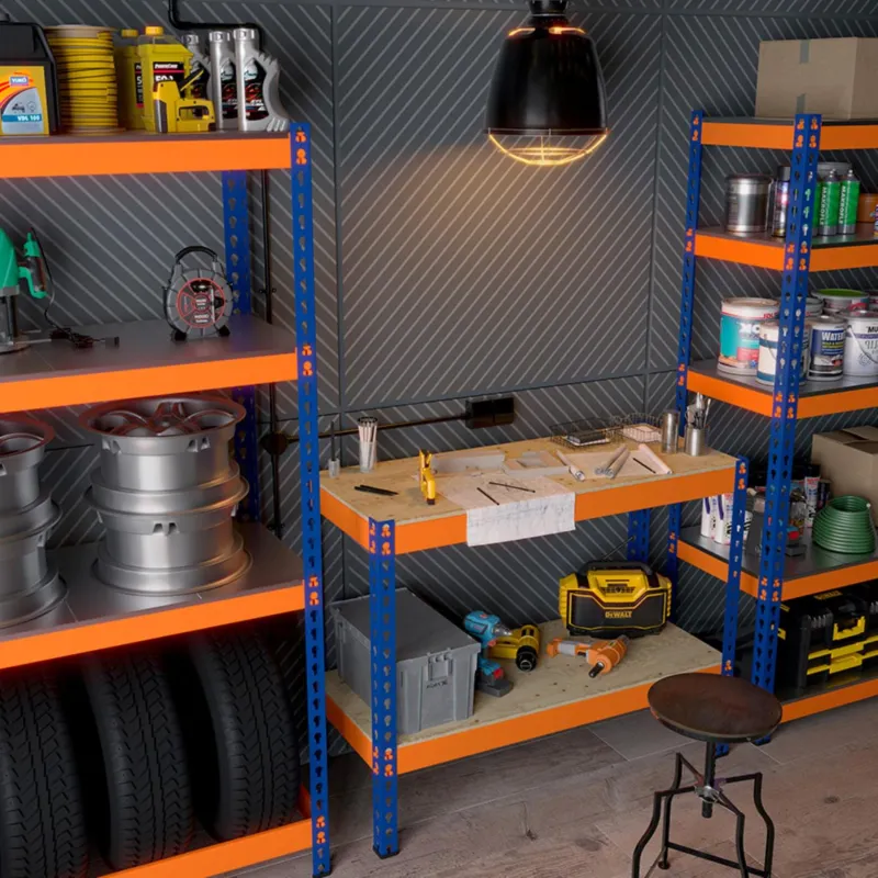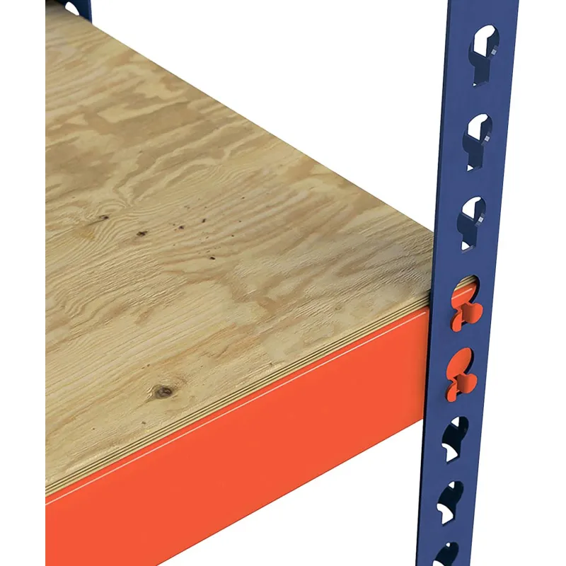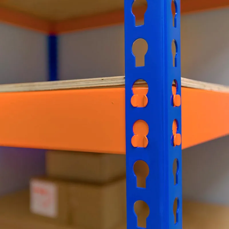 Стеллаж металлический с фанерным настилом полок — это универсальное решение для оснащения склада, мастерской, гаража. Отличается повышенной грузоподъёмностью (до 350 кг на полку и до 2500 на стеллаж). Надёжная, устойчивая конструкция подойдёт для размещения тяжёлых грузов, оборудования, автомобильных комплектующих. Стяжки крепятся к стойкам с помощью зацепов, стеллаж собирается без болтов и специальных инструментов. Стойки изготовлены из Г-образного стального холоднокатаного профиля, перфорированы по всей длине с шагом 45 мм, что позволяет установить полки на любой нужной высоте. Настил полок выполнен из влагостойкой фанеры толщиной 10 мм. Стойки комплектуются пластиковыми подпятниками, которые защищают напольное покрытие от повреждений. Зацепное крепление, полностью безболтовое крепление стеллажа позволяет собрать его без инструментов за несколько минут. Благодаря перфорации стоек можно легко регулировать расстояние между полками с шагом 45 мм. Сочетание ярко-оранжевых стяжек и синих стоек добавит цветовых акцентов в интерьер помещения. Преимущества: простая сборка, безболтовое крепление, прочность и долговечность, большая грузоподъёмность, яркая расцветка, не царапает пол.